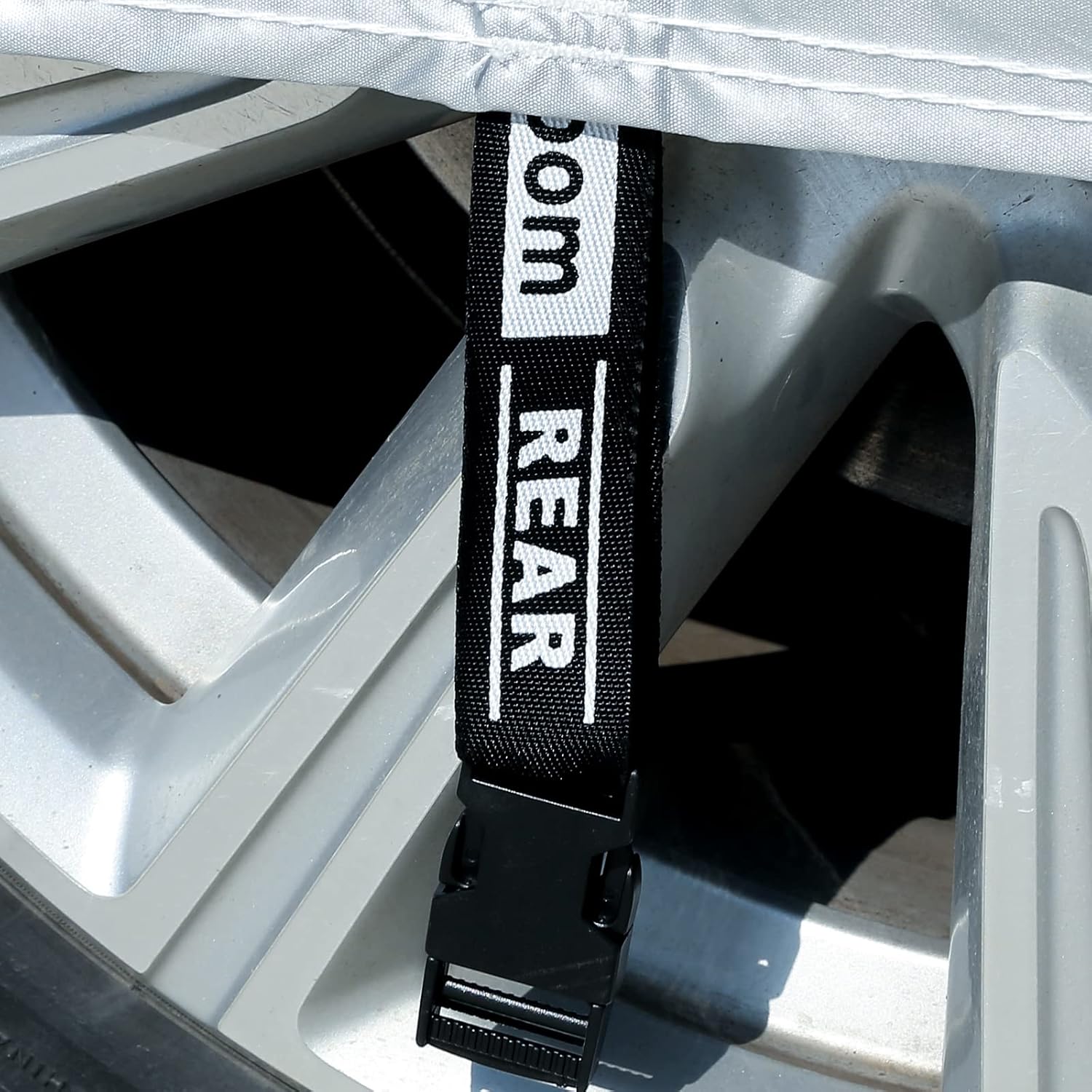 - 【Professional Design】1. driver door classic zipper design for easy access and convenient. 2. windproof straps & elastic hem at front and rear to protect your car cover from blown away by heavy wind. 3. equipped with combination lock, security anti-theft. 4. reflective stripes remind others at night. 5. mirror pockets.