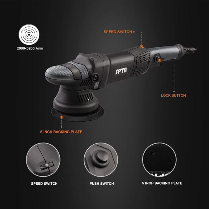 - EXCELLENT PERFORMANCE - The SPTA DAPSET-US is a 110V 6.5A dual-action polisher. With powerful motor, this random orbital polisher is perfect for polishing and removing swirls, scratches, and defects from all painted vehicles, reappearing the shine of your car. You can also use it to sand wood or metal,POWERFUL POLISHER - Eccentric polisher with 750W power, light body, easy replacement of carbon brushes. Constant power and constant speed function, more stable.