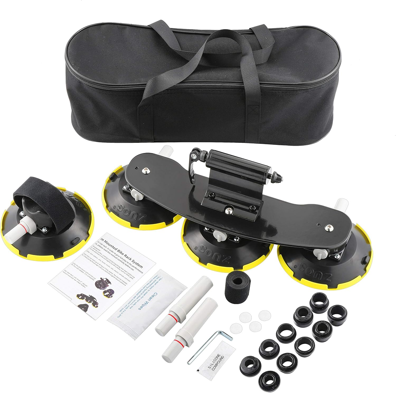 - vacuum mount bike carrier system consists of a high quality steel deck with three 6" vacuum mount that's home to the one fork holders, as well as a 6" separate vacuum-mounted rear wheel holders. Each suction cup uses durable UV and weather resistant concave rubber pad so that they can be attached to flat and cured surfaces.Synthetic EPDM rubber attaches without damaging your car paint.