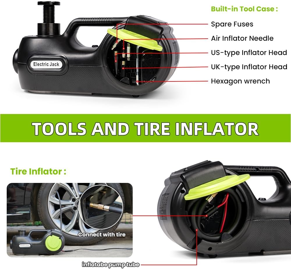 - 【All in One Repair Kit】This car repair kit includes a 5T hydraulic jack, tire inflator, and impact wrench to meet all your needs for tire replacement and inflation. You can get power from the car battery through the 12V cigarette lighter or through the battery clamp.The electric car jack can lift the car (less than 5 tons) to its maximum height within 2 minutes (height range: 6.1~21.7 inches).