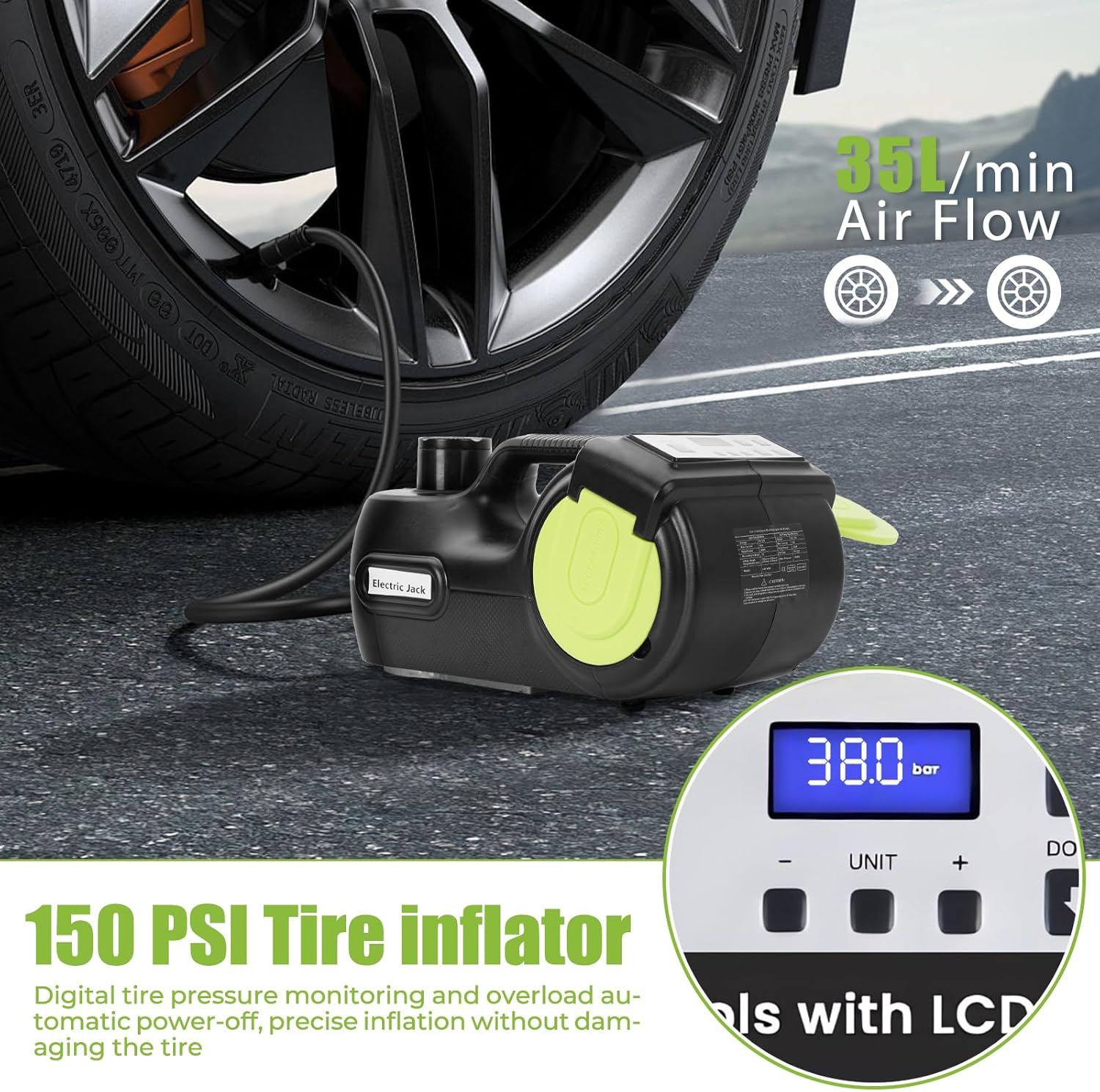 - 【Portable Tire Inflator】The electric hydraulic jack is equipped with a 150 PSI tire inflator and a digital pressure gauge is installed in it for viewing of inflation pressure. This 12V portable air compressor produces a flow rate of 35L/min, which can inflate your tires quickly,no need to worry about the tire-broken emergency during the journey.