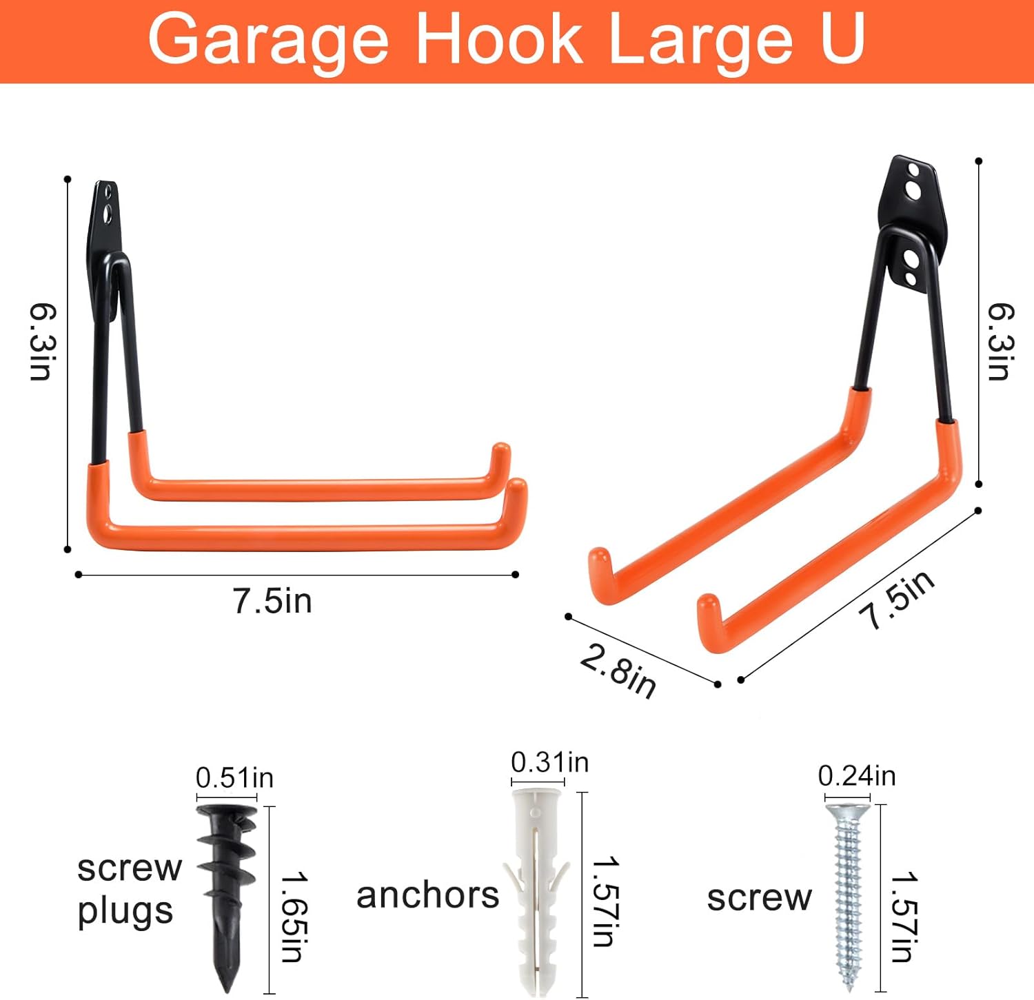 AOBEN Garage Hooks Heavy Duty, Steel Garage Storage Hooks, Utility Tool Hangers and Combinable Wall Mount for Organizing Ladder, Hold Chairs, Heavy Tools (Large U, 4 Pack)