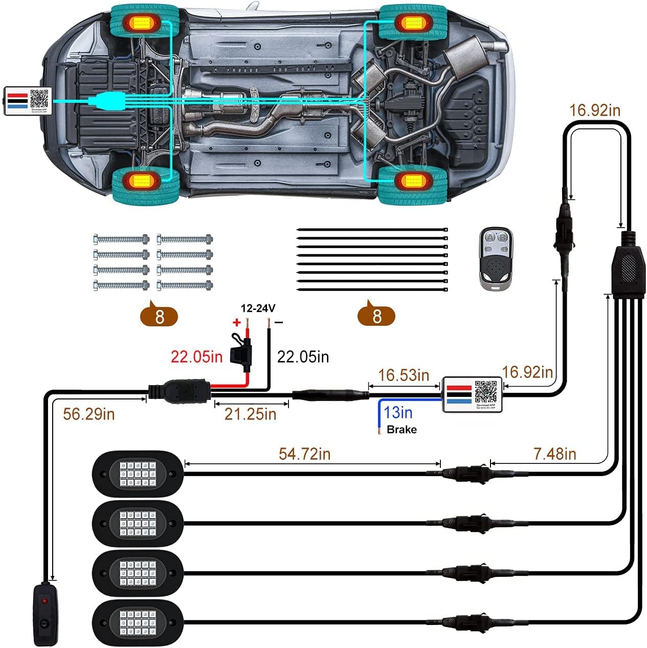 - [ Easy Installation & Widely Application ] ➤ Sacn QR code on driver box or user manul to download APP, the app is compatible with iOS 7/Android 4.3 or above, switch on phone bluetooth quick connect APP to setup lighting effect. Rock Lights can be widely used not only Off Road, 4X4, Motorcycle, ATV/SUV/UTV, Boat etc., but also in indoor, chassis lights, deck lights, ambient light, neon lights, etc. If you need an extension cable, please purchase the asin: B08VN4G4H3.