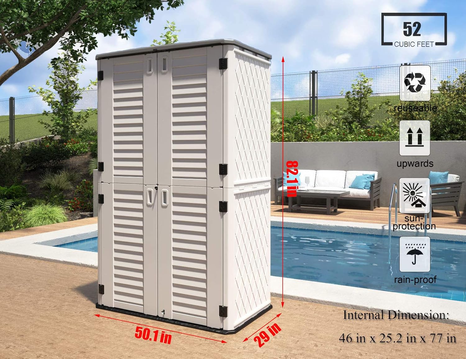 - 【MATERIAL AND DESIGN】 — Resin vertical storage cabinet double-layered ,Vertical design for storing long handled tools and garden accessories.HDPE resin panels has no odor, uv-resistant,won't rust, decay and needn't virtually maintenance. Blow Molded with resin twin wall panels make the storage sheds strengthen, Colorfast , clean easily as well.