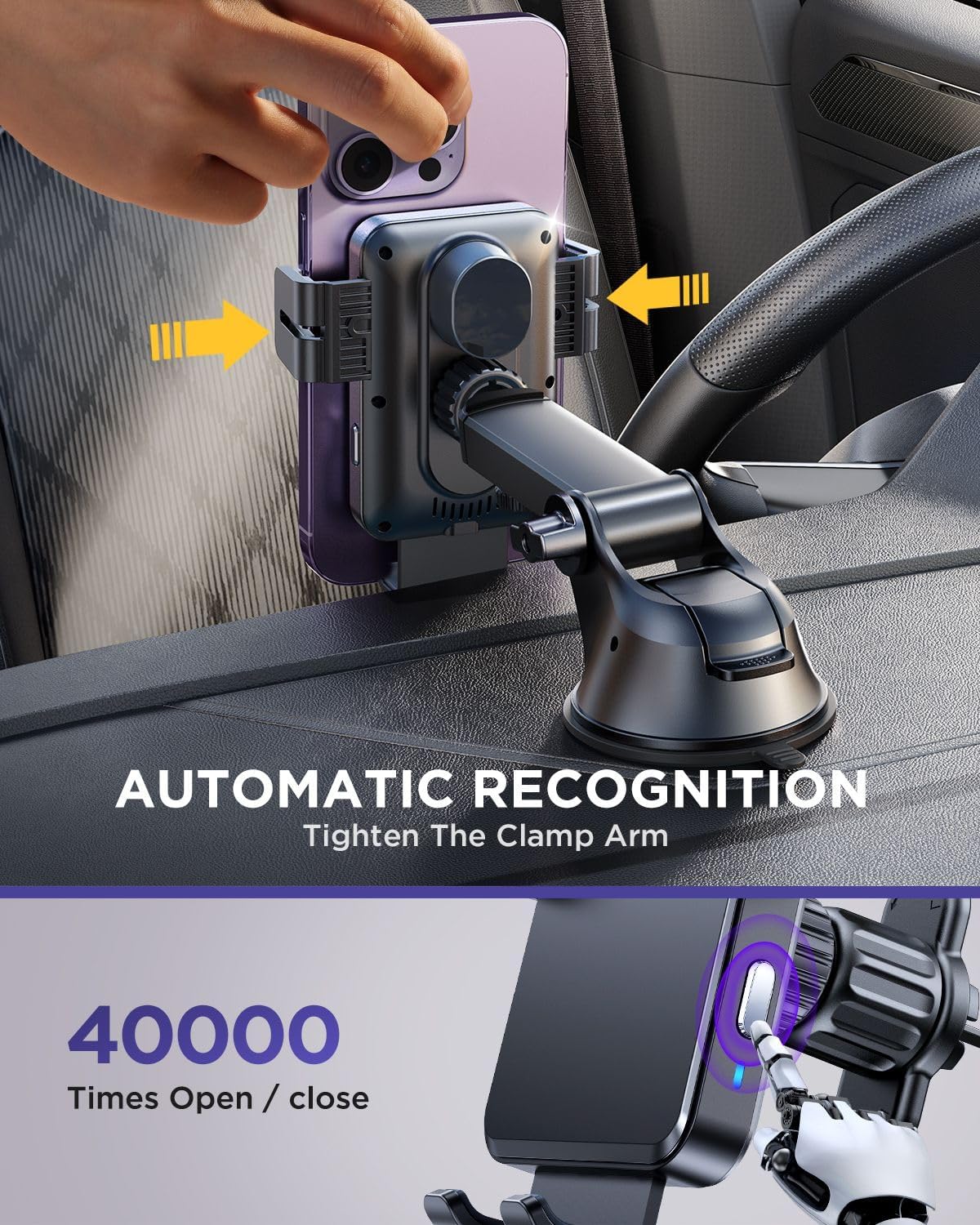 - Super Stable Base: phone mount for car wireless charger's base is equipped with a powerful suction cup and professional 3M adhesive (high temperature resistant). The base's suction cup has been tested thousands of times, it can absorb more than 20 pounds of objects without dropping. Even if passing speed bumps or driving on mountain roads, you don’t need to worry about it falling. In addition, the bracket arm and clip are equipped with silicone pads for anti-slip and anti-vibration