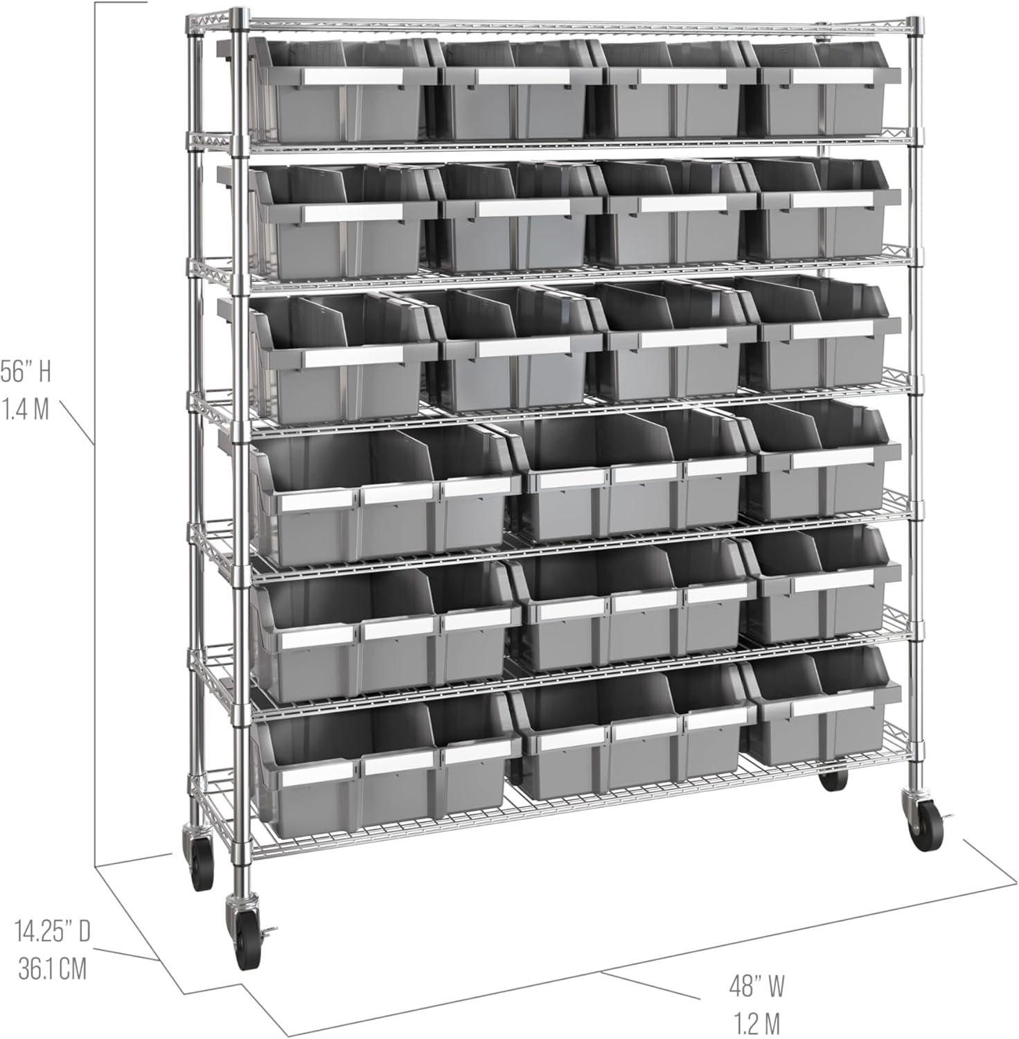 - 7 TIERS — Shelving system includes seven steel wire shelves (48” x 14”) in a durable silver powder-coated finish.
