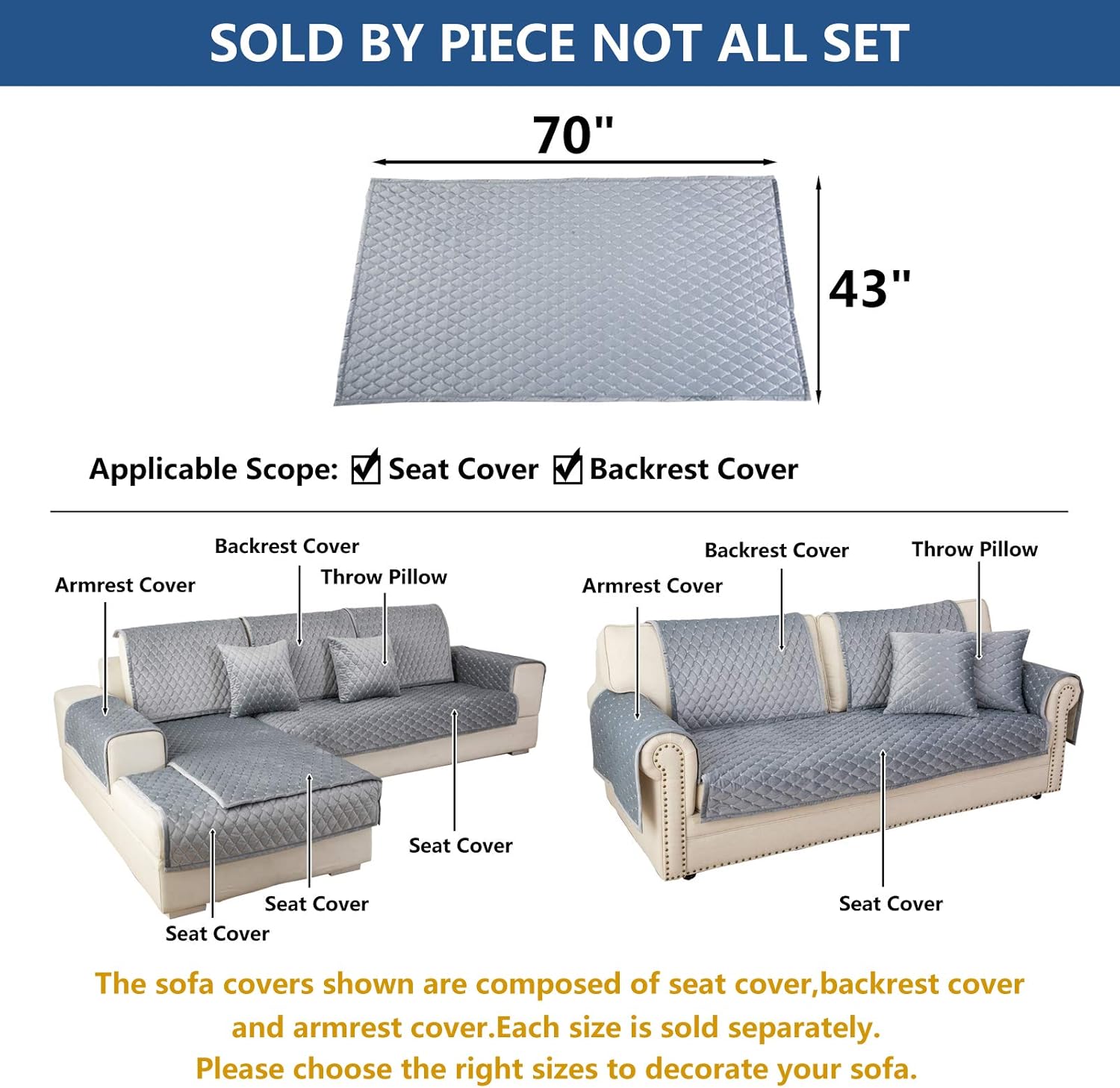 Eismodra Couch Cover,Sectional Couch Covers,Sofa Covers for 3 Cushion Couch,Anti-Slip Sofa Slipcovers for Dogs Cats Kids Loveseat Recliner L Shaped Armrest Backrest,Light Gray 43''x70''(Only 1 Piece)