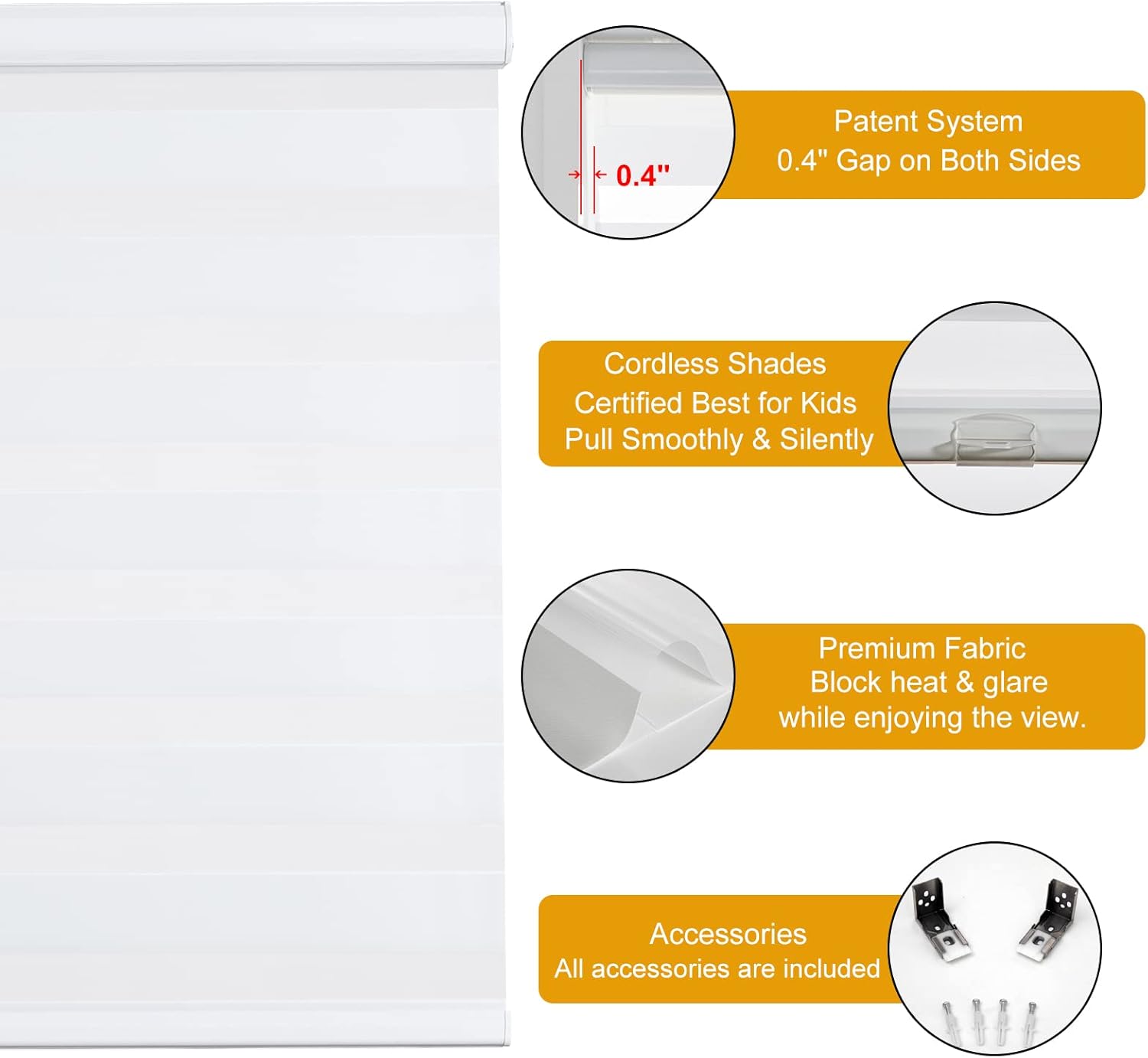 Persilux Cordless Zebra Blinds for Windows Free-Stop Window Shades (27" W X 72" H, White) Dual Layer Light Control for Day and Night, Light Filtering Sheer Shades for Home, Bedroom, Easy to Install
