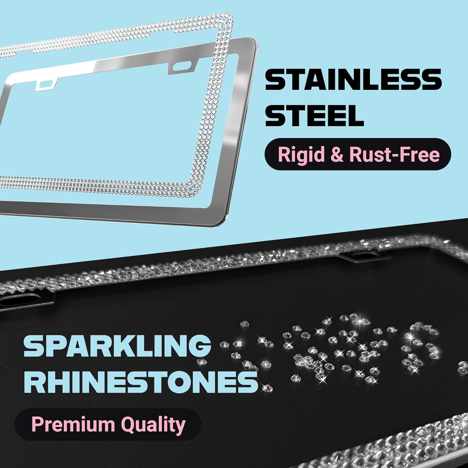 Dazzling Bling License Plate Frames for Women - 2 Pack, 1600 Premium Rhinestones, Rust-Free Stainless Steel, Street Legal Slim Design, Sparkly Diamond Car Tag Holders with Glitter Crystal Screw Covers