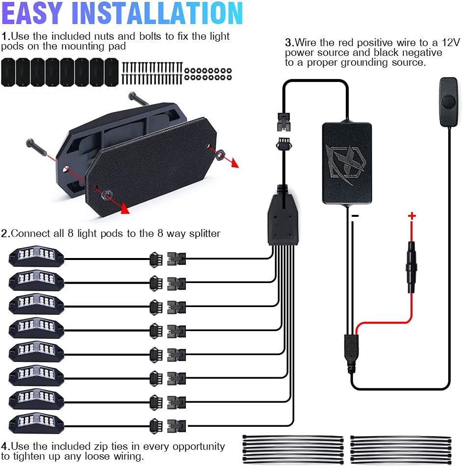 - Easy Installation : Lightweight rectangular shapes make installation simple. Use the included hardware to mount the underglow pods under your vehicle or in the wheel wells. Perfect for trucks, cars, SUVs, UTVs, ATVs, RZRs, vans, motorcycles, boats, and more. Also provides ambient lighting wherever you need it.