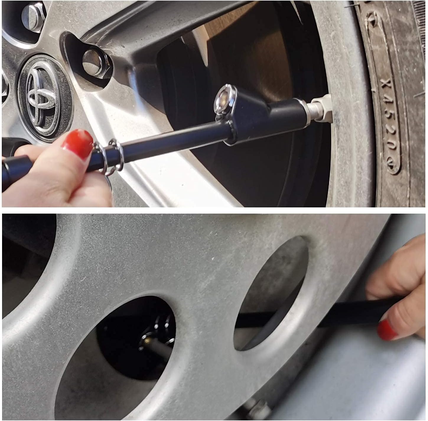 - 4.HOW TO USE: Push the chuck on the tire valve to get the air out of the tire, the scale bar will slip out and then you can get the pressure reading.Once finished the adjustment of the tire pressure, don't forget to screw on the valve caps
