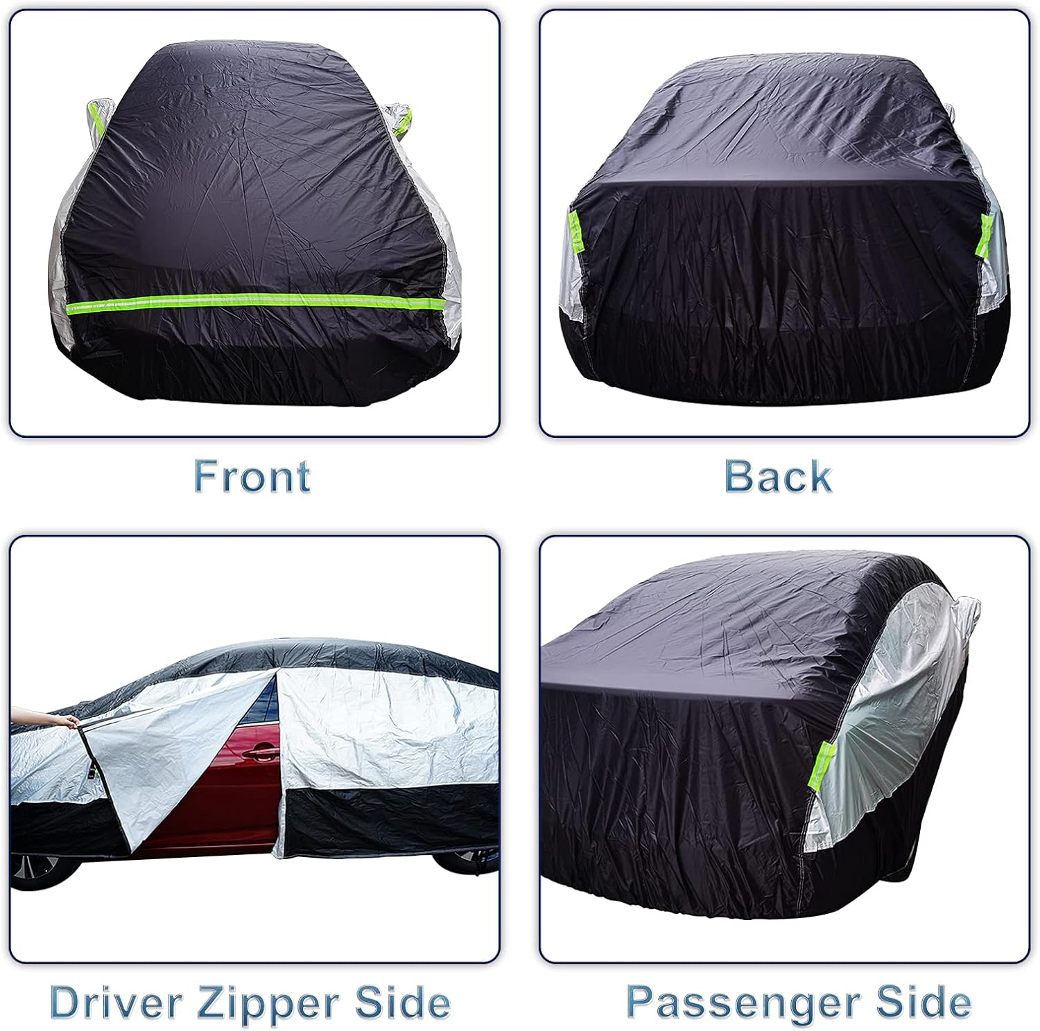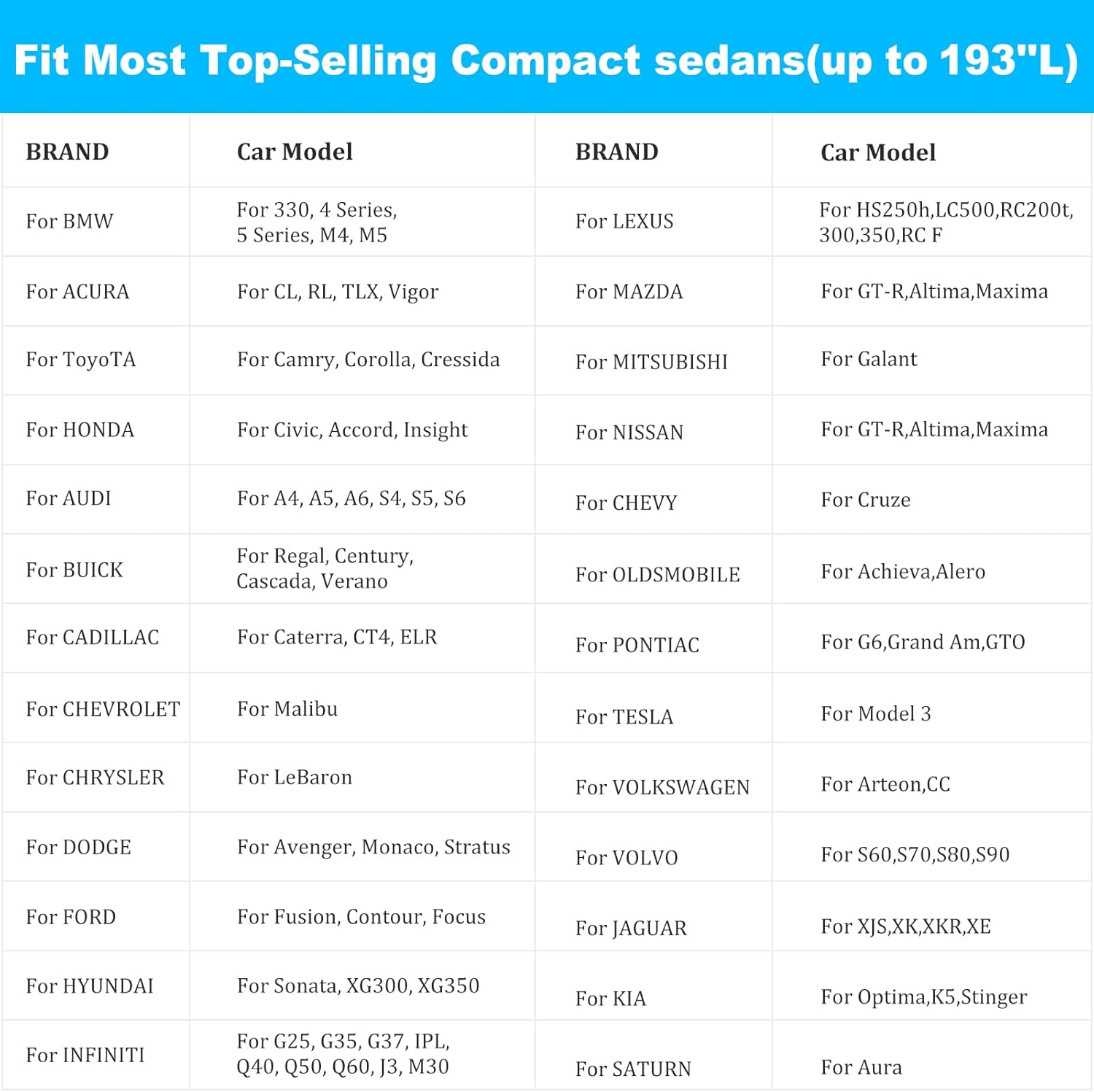 - 【Universal Vehicle Fit】Universal Car Cover fits Toyota Corolla/Honda Civic/Sentra/Ford Focus/Chevy Cruze/BWM 330/Audi A4. Size: 193''(L) x 70.8''(W) x 59''(H). Confirm your car model and dimensions before ordering. Note: Ensure dry car body before use.