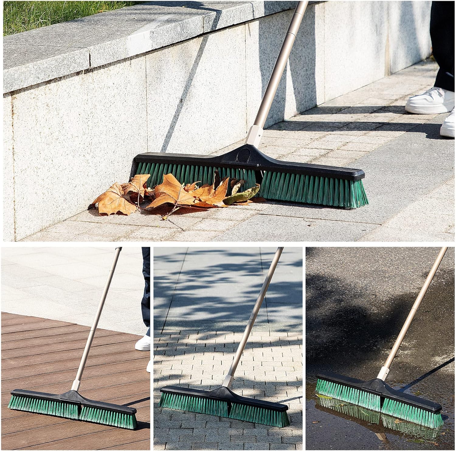 - 【45° Ergonomic Angle Design for Effortless Sweeping】The industrial-grade push broom features a 45° angled head to effortlessly reach corners and tight spaces, reducing strain on your knees and back. Ideal for outdoor push broom tasks like scrubbing stubborn dirt from garage floors or sweeping wet leaves off shop surfaces. The threaded connection between the broom head and handle ensures a secure, wobble-free fit during intensive use