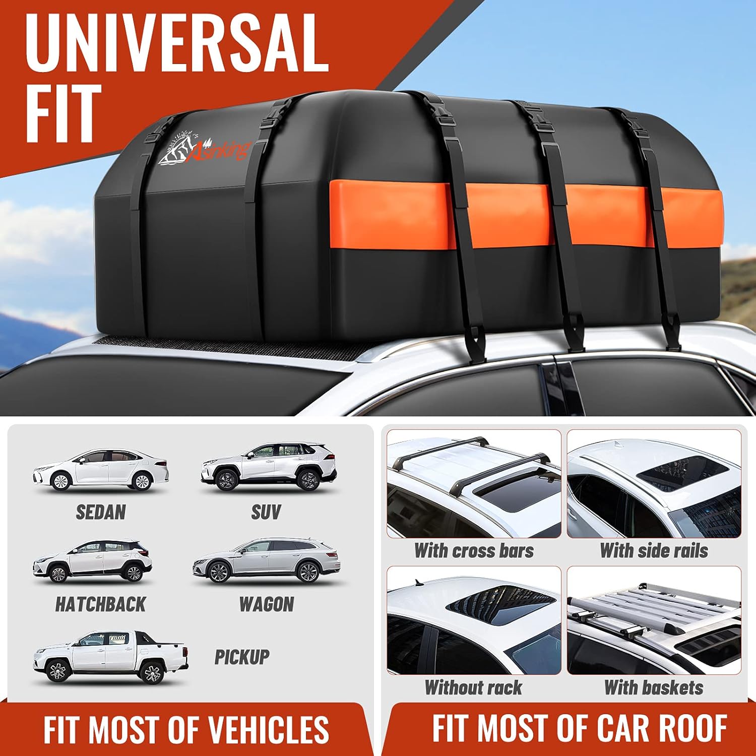 - 【SECURE FIT & LARGE CAPACITY】 Our 21 cubic feet rooftop cargo bag is compatible with vehicles with our without roof rack, the large capacity can keep the shape nicely, even when holding many luggage cases, blanket, tents, sleeping bags and more.