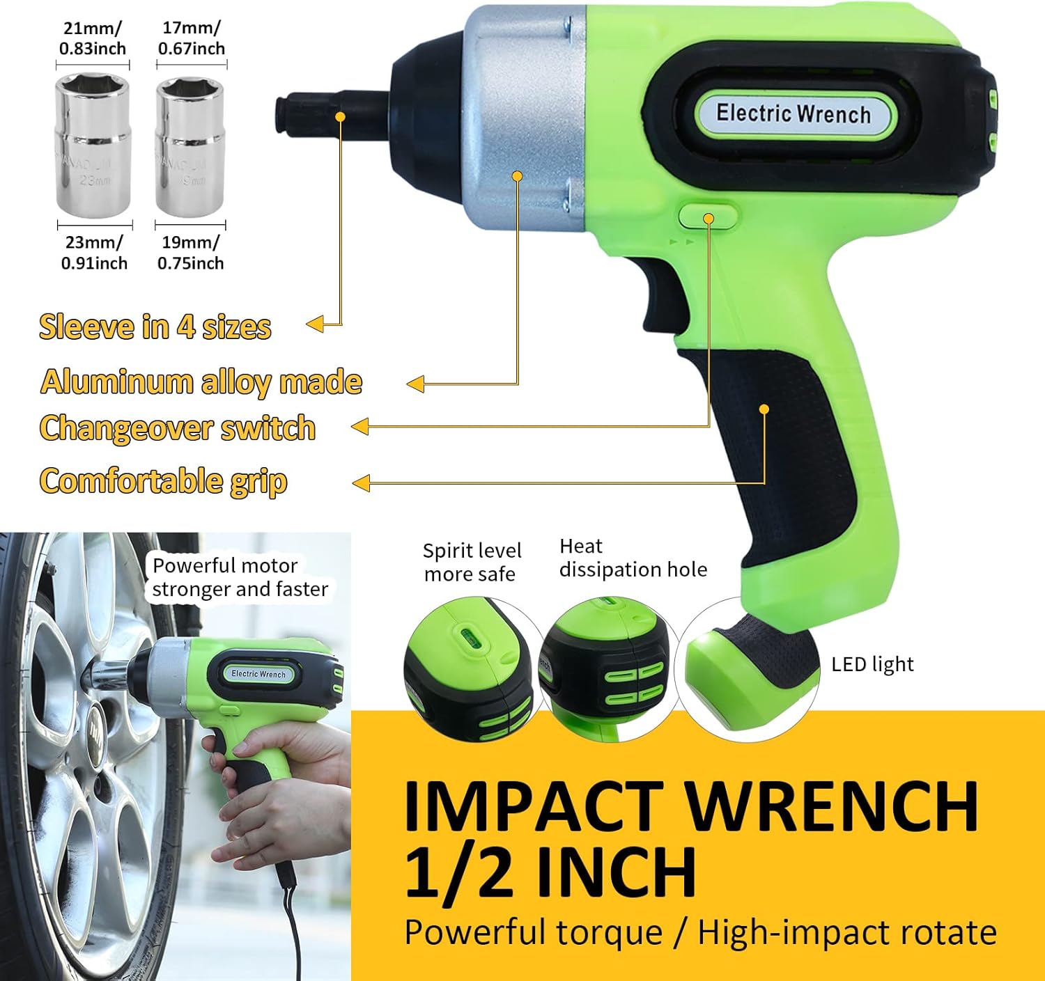 - [Electric Impact Wrench] This 12V DC electric car jack kit includes a 1/2 inch portable electric impact wrench with two sleeves with four sizes, matching most vehicles. Max torque 420 N.M.
