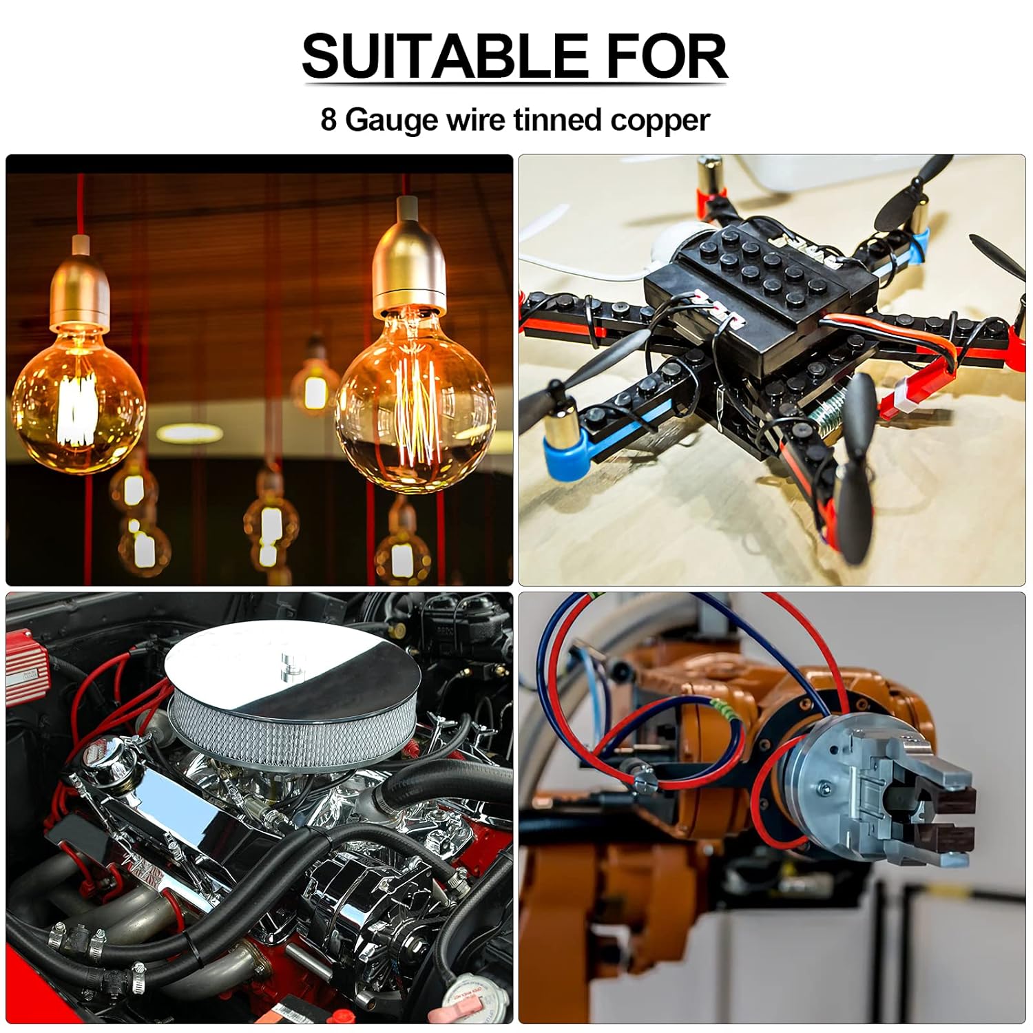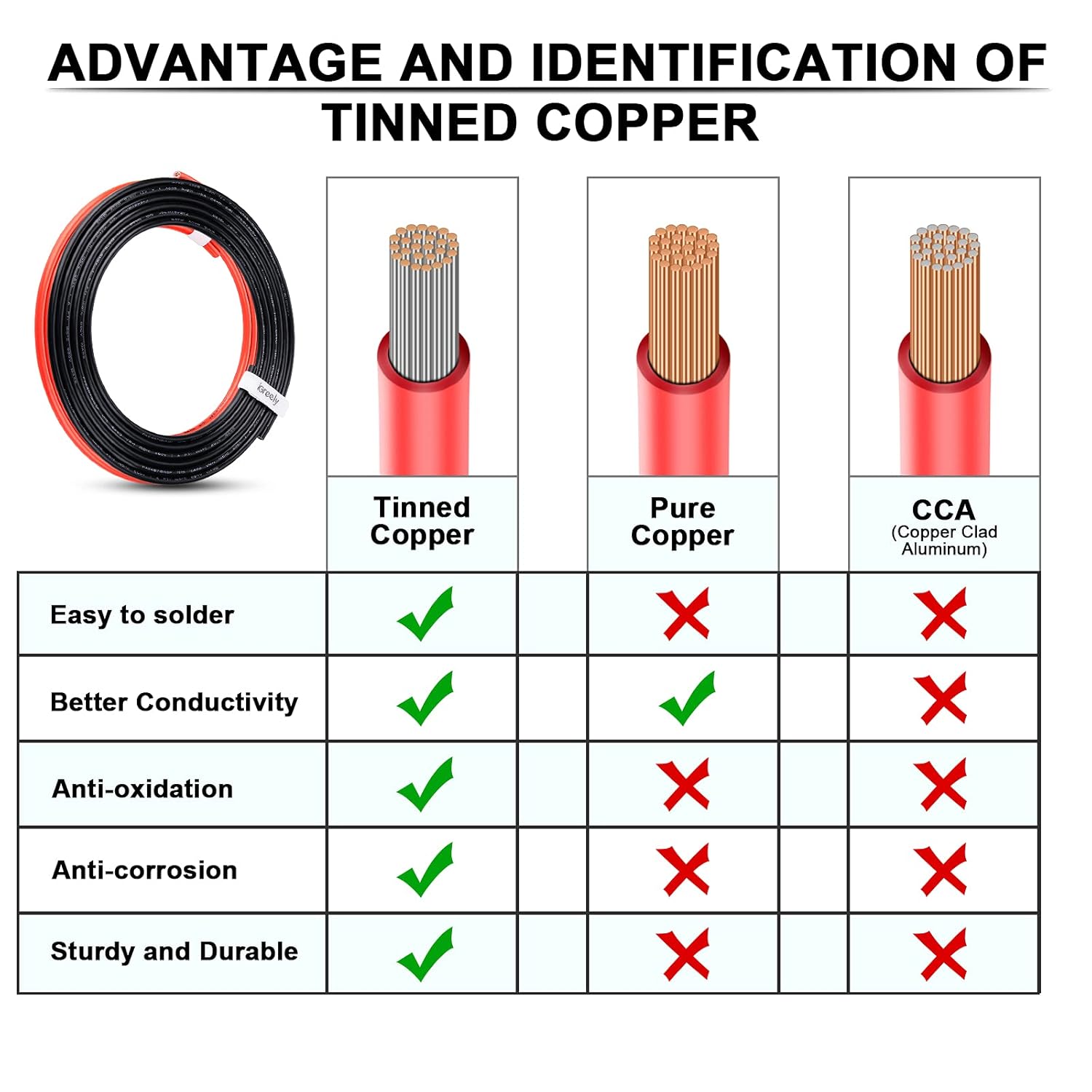 - UL1015 Listed: Tinned Copper 8 AWG Cable, 30 ft Red & 30 ft Black, 169 strands 0.254 mm tinned copper wire, protecting them from corrosion, and easy to solder.