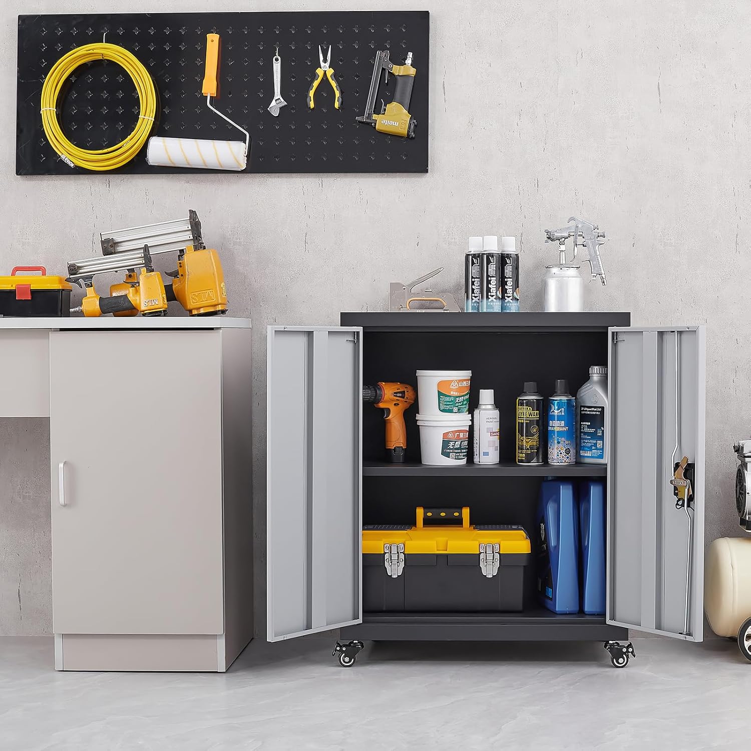 LUCYPAL Metal Storage Cabinet with 2 Doors,Steel Storage Cabinet with Adjustable Shelves and Wheels,Locking Tool Cabinets for Office,Home,Garage,Black&Grey 31.5" H