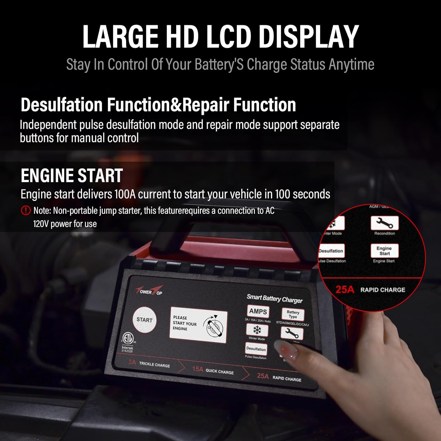 - HD LCD Screen and 8-Stage Intelligent Charging: With true 8-stage smart charging (desulfurization, soft start, bulk charge, absorption, analysis, repair, float, and pulse maintenance), it optimizes battery life and repairs batteries without overcharging or damaging them. The HD LCD screen allows you to view the charging stage and parameters at any time rather than leaving you guessing, keeping you informed of the charging status