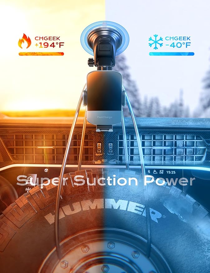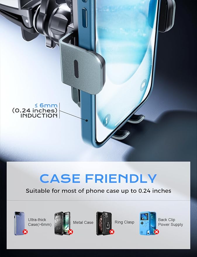 - 【Case Friendly & Flexible Angle Adjustment】Enjoy hassle-free charging through phone cases up to max 4mm(0.16 inch) thick with our CHGeek phone holder for car. Please note that metal cases, magnets, credit cards, grips, and stands may interfere with charging. For optimal viewing and safe driving, the 360° rotating sphere and retractable & foldable bracket allow you to adjust the angle to your preference. The Otterbox phone case is too thick, causing it to be incompatible with this wireless charger.