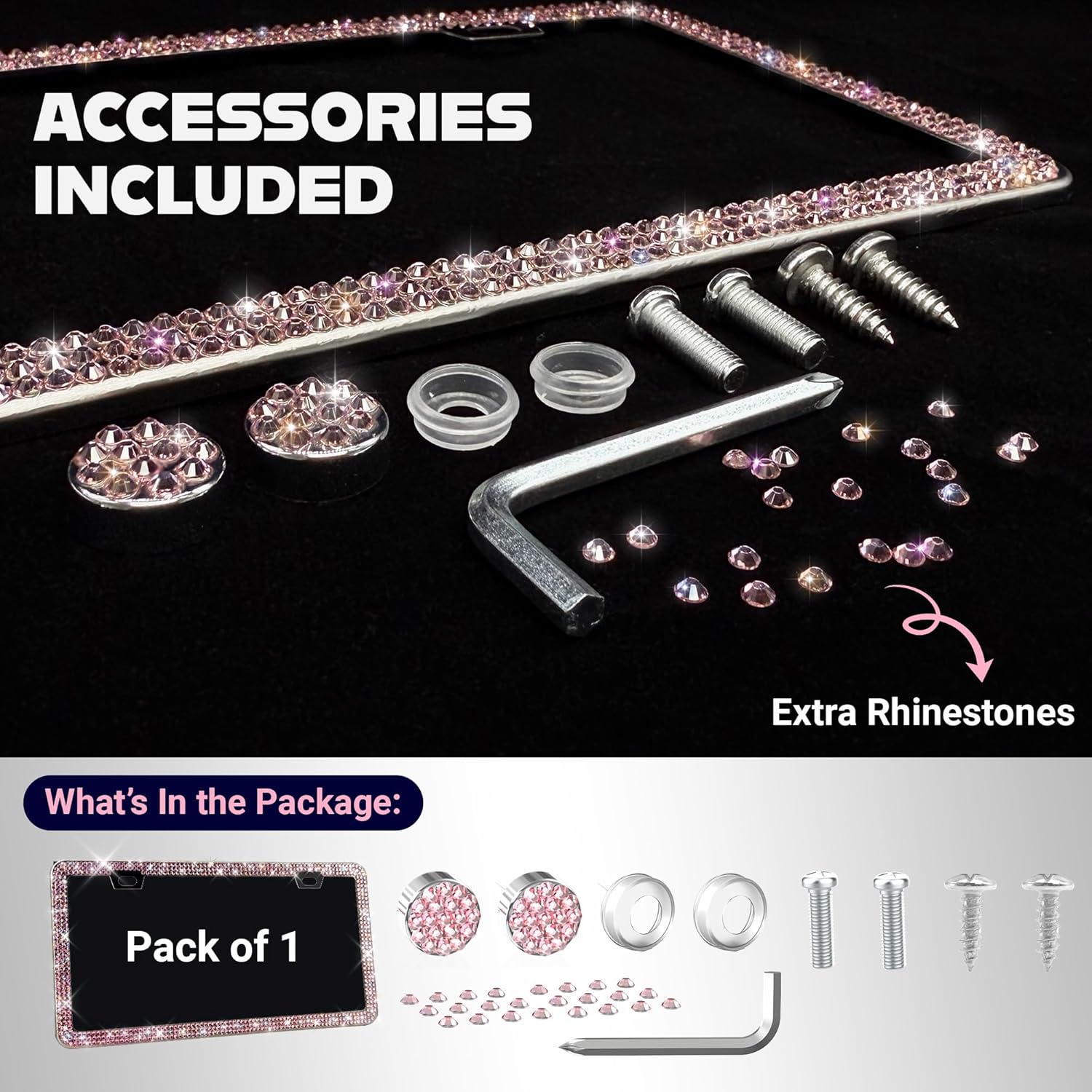 - Pink Rhinestone Bling License Plate Frame for Women: Add a girly, glittery touch to your ride with this stunning 1-pack that’s made to shine.