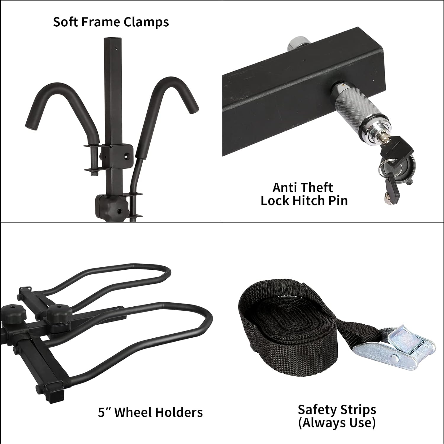 - ā HIGH COMPATIBILITY: Fit 17-29 inch wheels, fit 31.5" to 62.5 inch wheelbase, up to 5 inch tires, 2 inch receiver, it is also equipped with safety strap, security hitch lock, hitch tightener and other necessary hardwares.