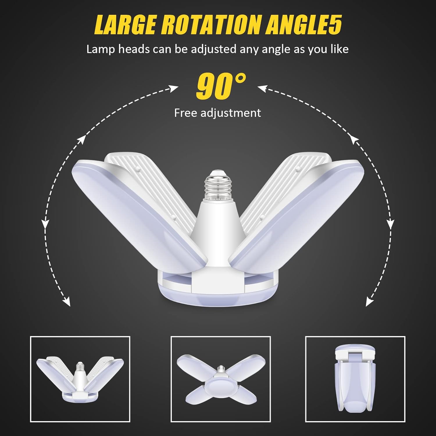 - Easy To Install:The led lights for garage ceiling with E26/E27 standard base. You can install the deformable garage led light easily just like screwing a traditional light bulb, no need for extra tools, no more wiring, and professional electricians. Note: Please turn off the power before installation
