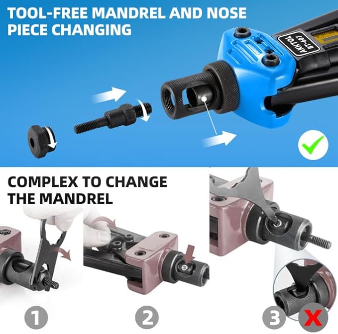 - Easy to Use: The knurled head lets you quickly change mandrels and nosepieces without extra tools. The detailed manual ensures straightforward rivnut installation, making it perfect even for beginners.