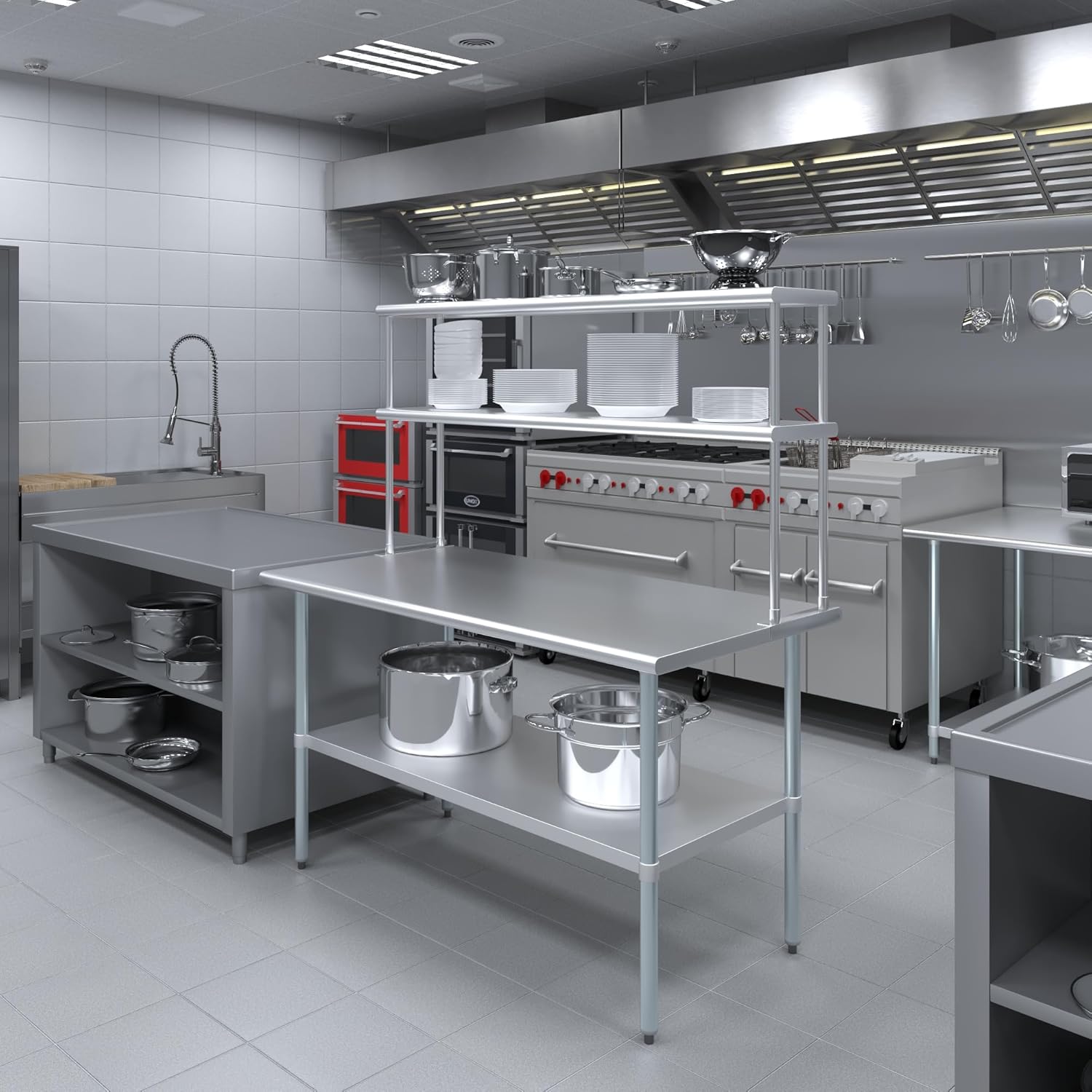 - WORK SAFETY: Work table top and double tier adjustable shelves are constructed from 18-gauge stainless steel, making this restaurant prep and serve table and double tier shelf combo set is durable and long lasting. The table top comes with a galvanized under-shelf for additional storage and adjustable legs for convenience. This table and shelf set is specifically designed and finished for use in a commercial or industrial setting, but is just as reliable in the home.