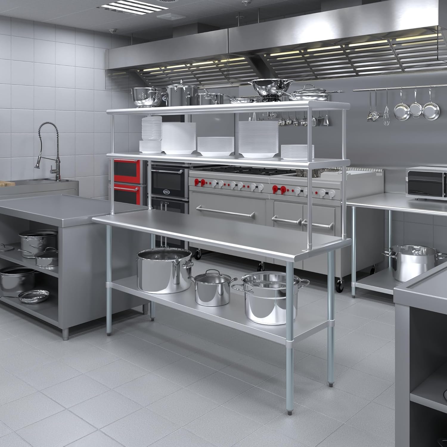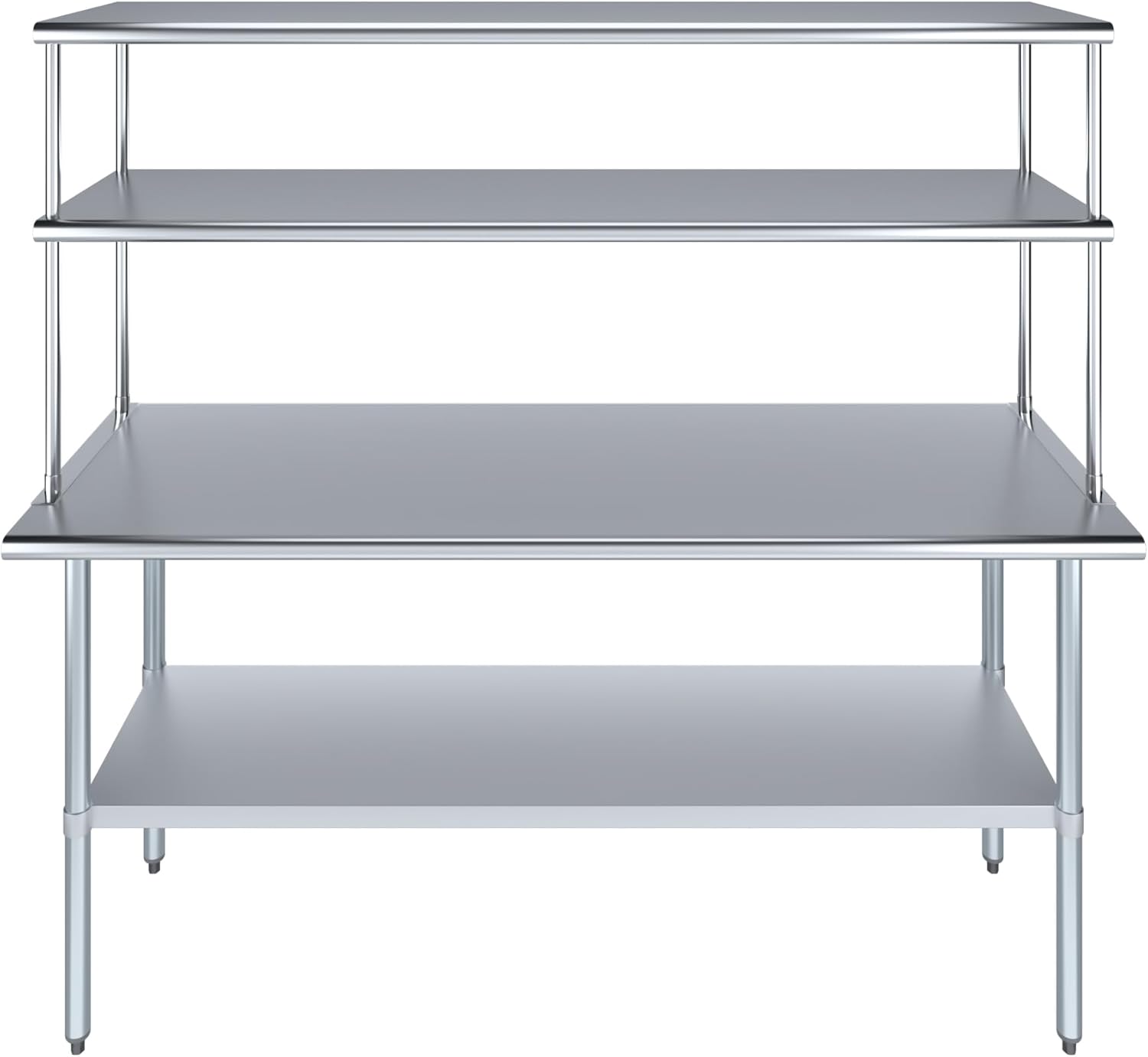 - WORK SAFETY: Work table top and double tier adjustable shelves are constructed from 18-gauge stainless steel, making this restaurant prep and serve table and double tier shelf combo set is durable and long lasting. The table top comes with a galvanized under-shelf for additional storage and adjustable legs for convenience. This table and shelf set is specifically designed and finished for use in a commercial or industrial setting, but is just as reliable in the home.