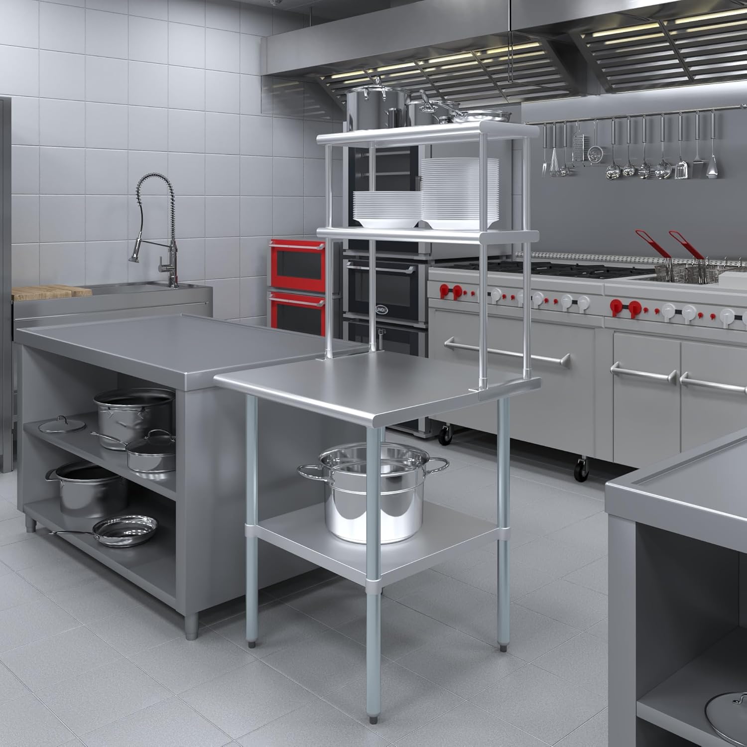 - WORK SAFETY: Work table top and double tier adjustable shelves are constructed from 18-gauge stainless steel, making this restaurant prep and serve table and double tier shelf combo set is durable and long lasting. The table top comes with a galvanized under-shelf for additional storage and adjustable legs for convenience. This table and shelf set is specifically designed and finished for use in a commercial or industrial setting, but is just as reliable in the home.