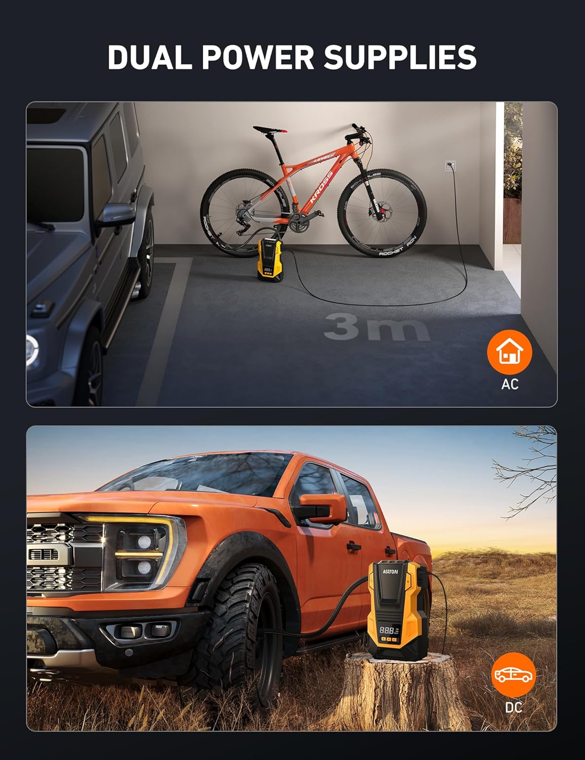 AstroAI AC/DC Tire Inflator Portable Air Compressor for Car, Air Pump for Car Tires, Car Accessories 150PSI with LED Light for Cars, Balls, Motorcycles, and Other CZK-3666 Yellow