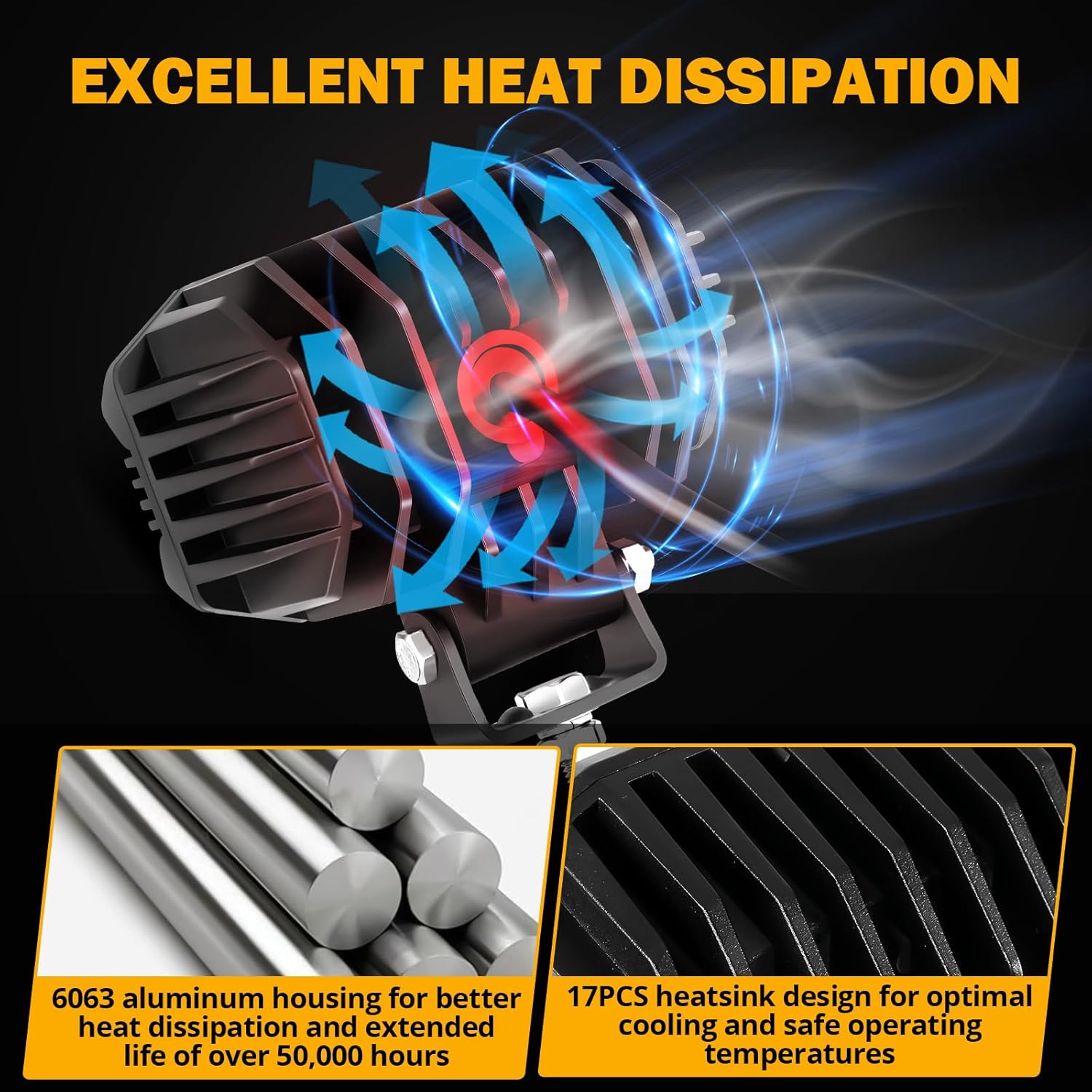 - 【EFFECTIVE HEAT DISSIPATION】Adopt low power consumption technology and fast cooling system. Die-cast 6063 aluminum alloy housing and thick enough heat sink help to dissipate heat faster and make it durable. Effectively extends the service life of the LED work light cover over 50,000 hours.