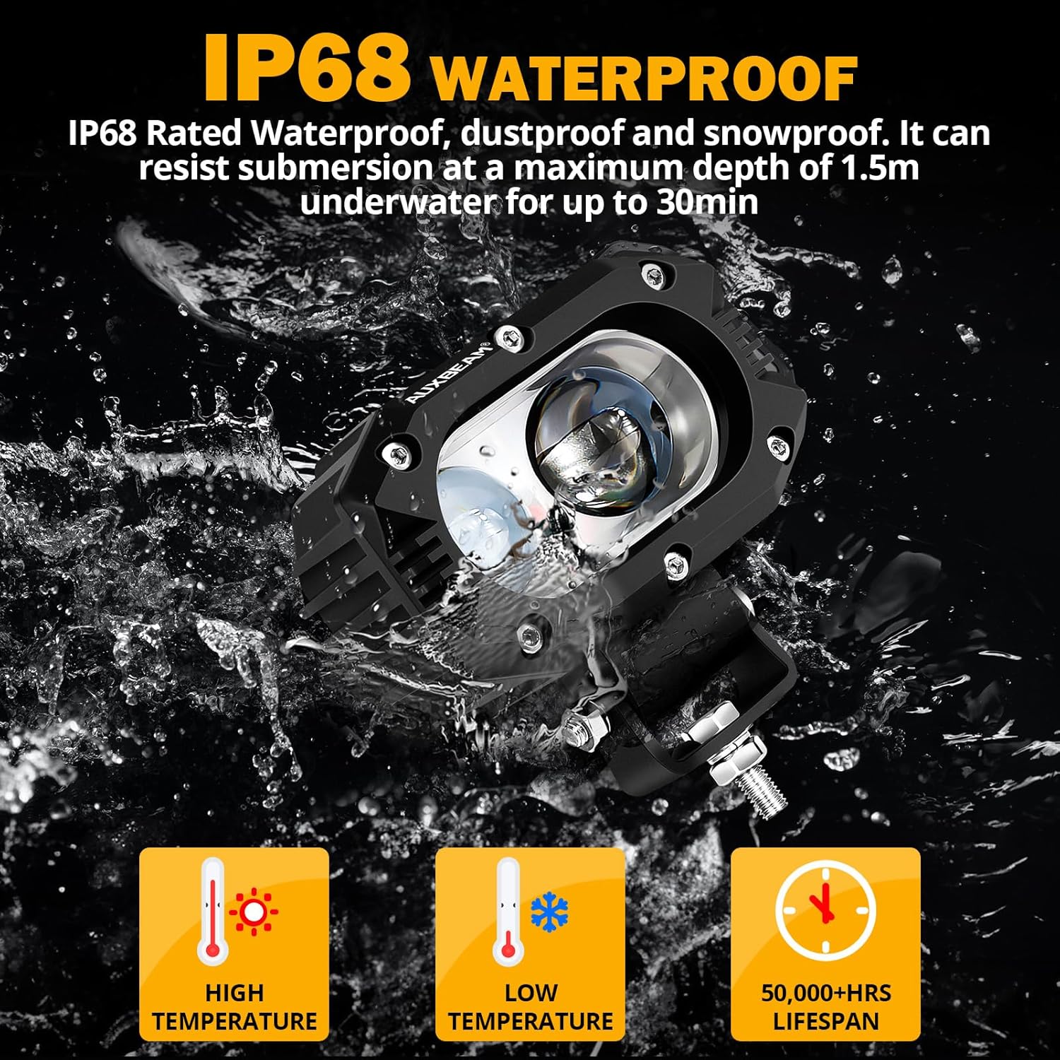 - 【CLEARER VISION】Auxbeam 4-inch spot light is equipped with 2*30W high-intensity 5050 LED chips and a specially designed 12D optical lens. It delivers a 6000LM spot beam and 6500K cool white light, ensuring longer and wider illumination and significantly improving visibility even in daylight conditions.