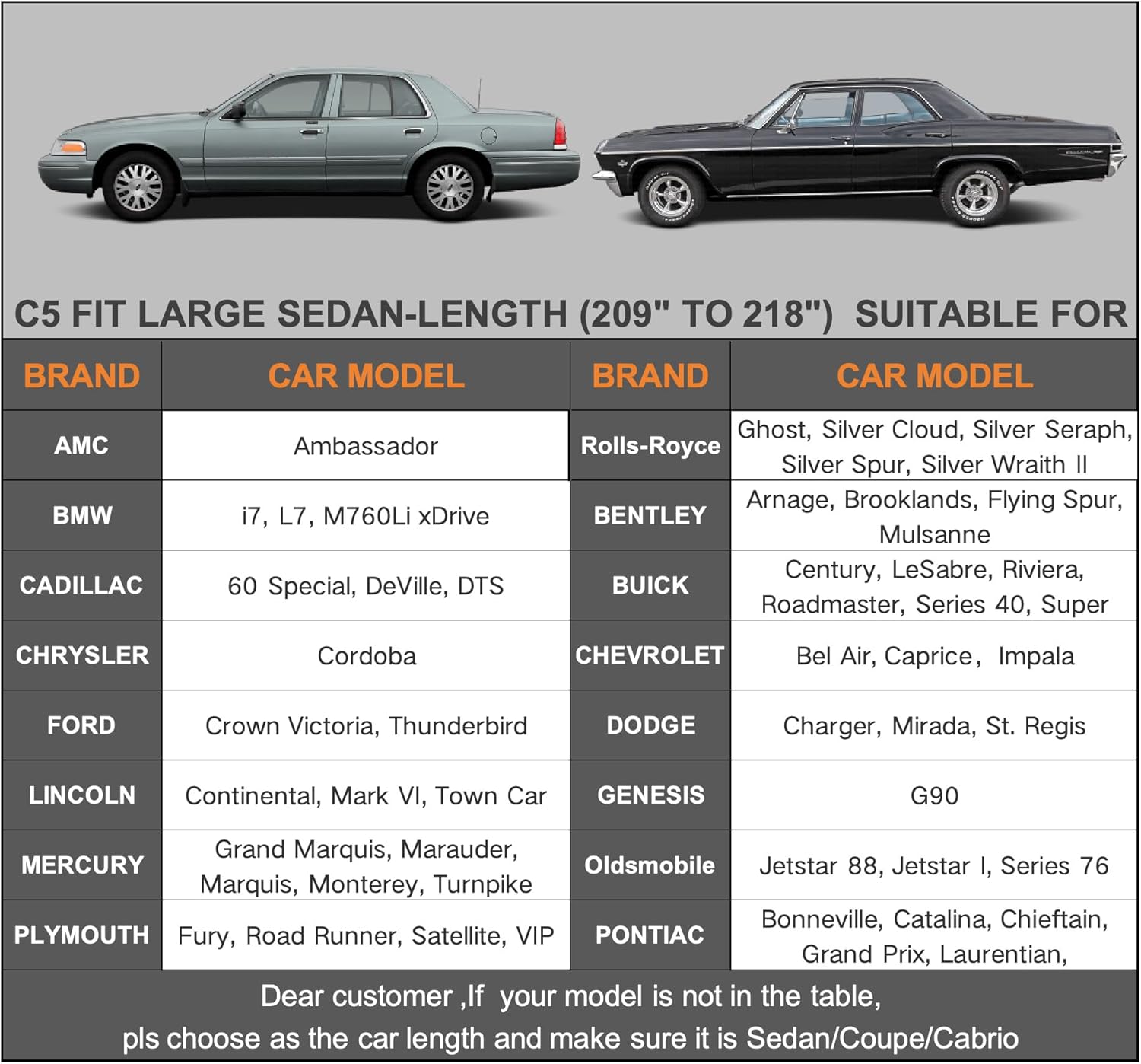 - 【Dimension C5】— Universal fit for large sedan Coupe Sports Car which length is 209 to 218 inch. (NOT FOR HATCHBACK/SUV). Come with a large enough and waterproof portable storage pocket to store the cover.