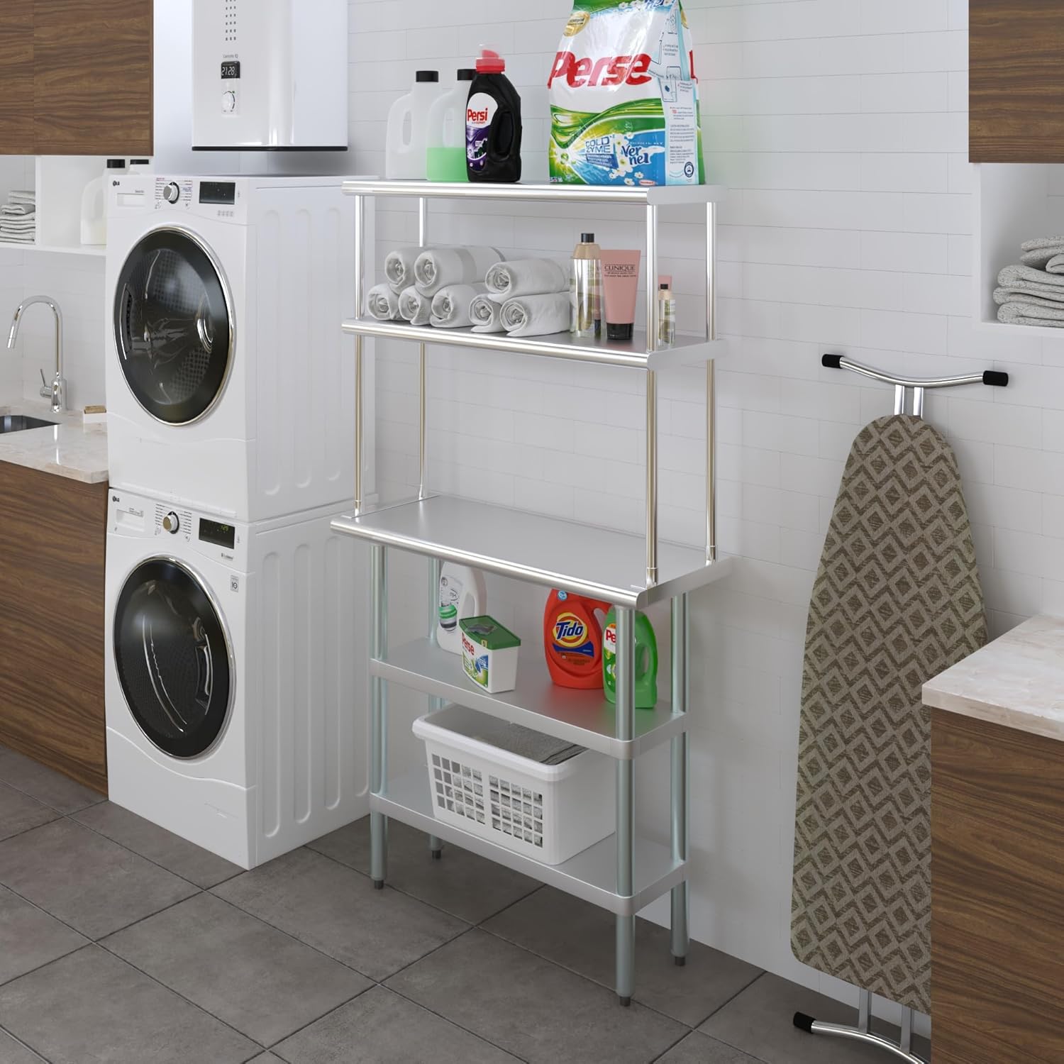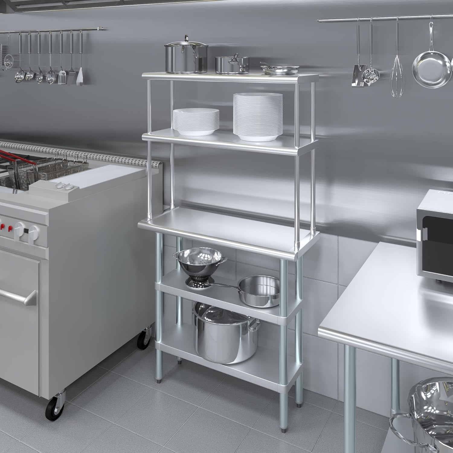 - WORK SAFETY: Work table top and double tier adjustable shelves are constructed from 18-gauge stainless steel, making this restaurant prep and serve table and double tier shelf combo set is durable and long lasting. The table top comes with a galvanized under-shelf for additional storage and adjustable legs for convenience. This table and shelf set is specifically designed and finished for use in a commercial or industrial setting, but is just as reliable in the home.