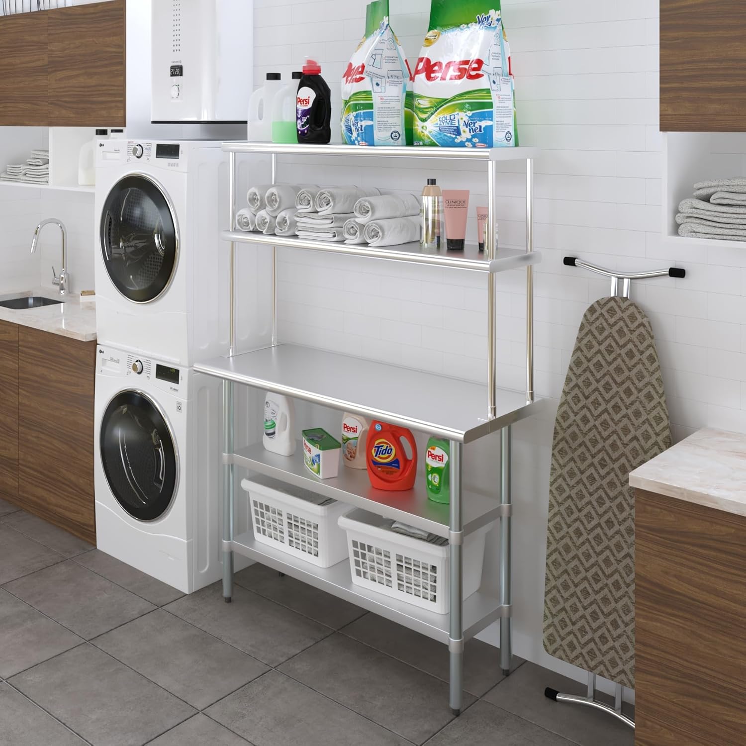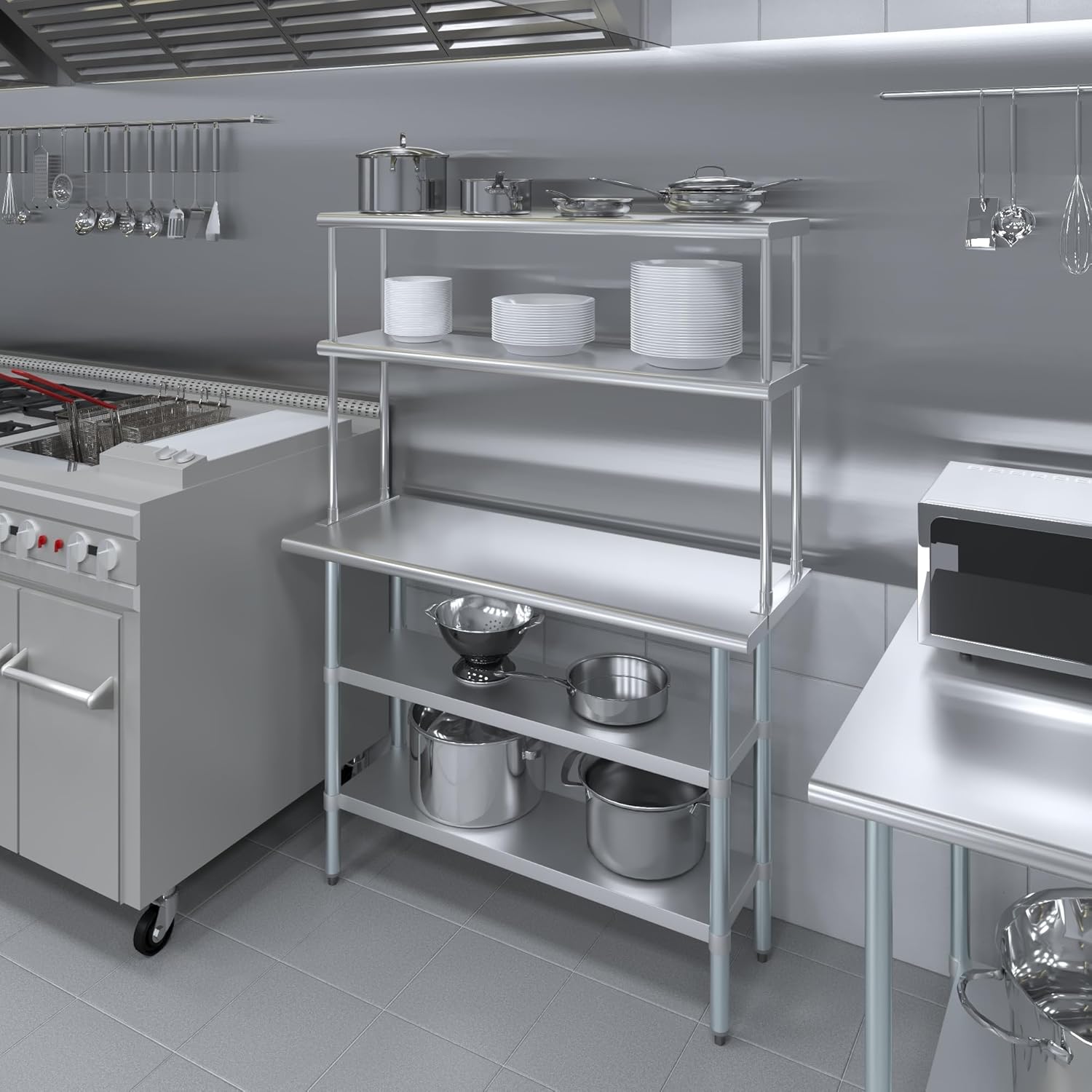 - WORK SAFETY: Work table top and double tier adjustable shelves are constructed from 18-gauge stainless steel, making this restaurant prep and serve table and double tier shelf combo set is durable and long lasting. The table top comes with a galvanized under-shelf for additional storage and adjustable legs for convenience. This table and shelf set is specifically designed and finished for use in a commercial or industrial setting, but is just as reliable in the home.