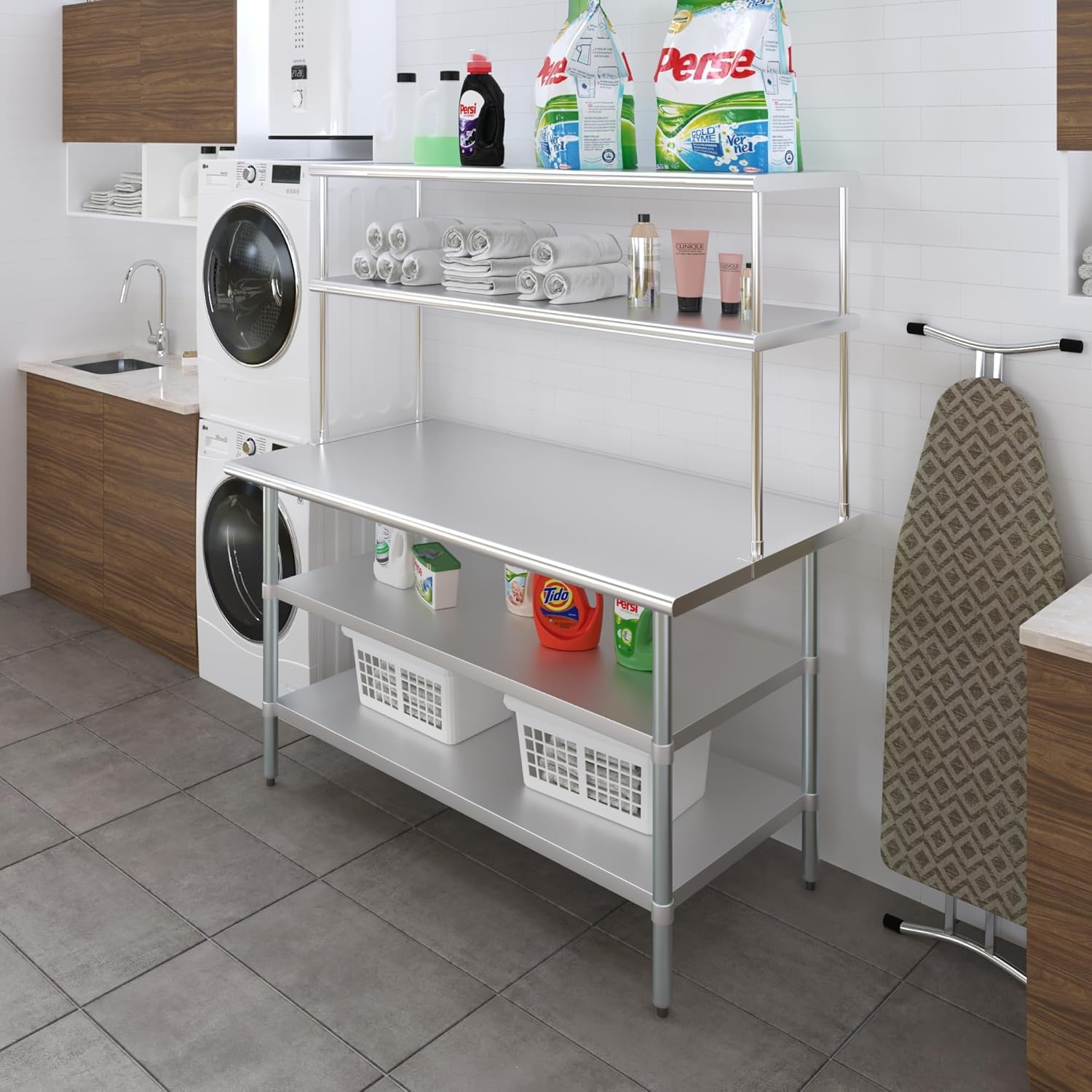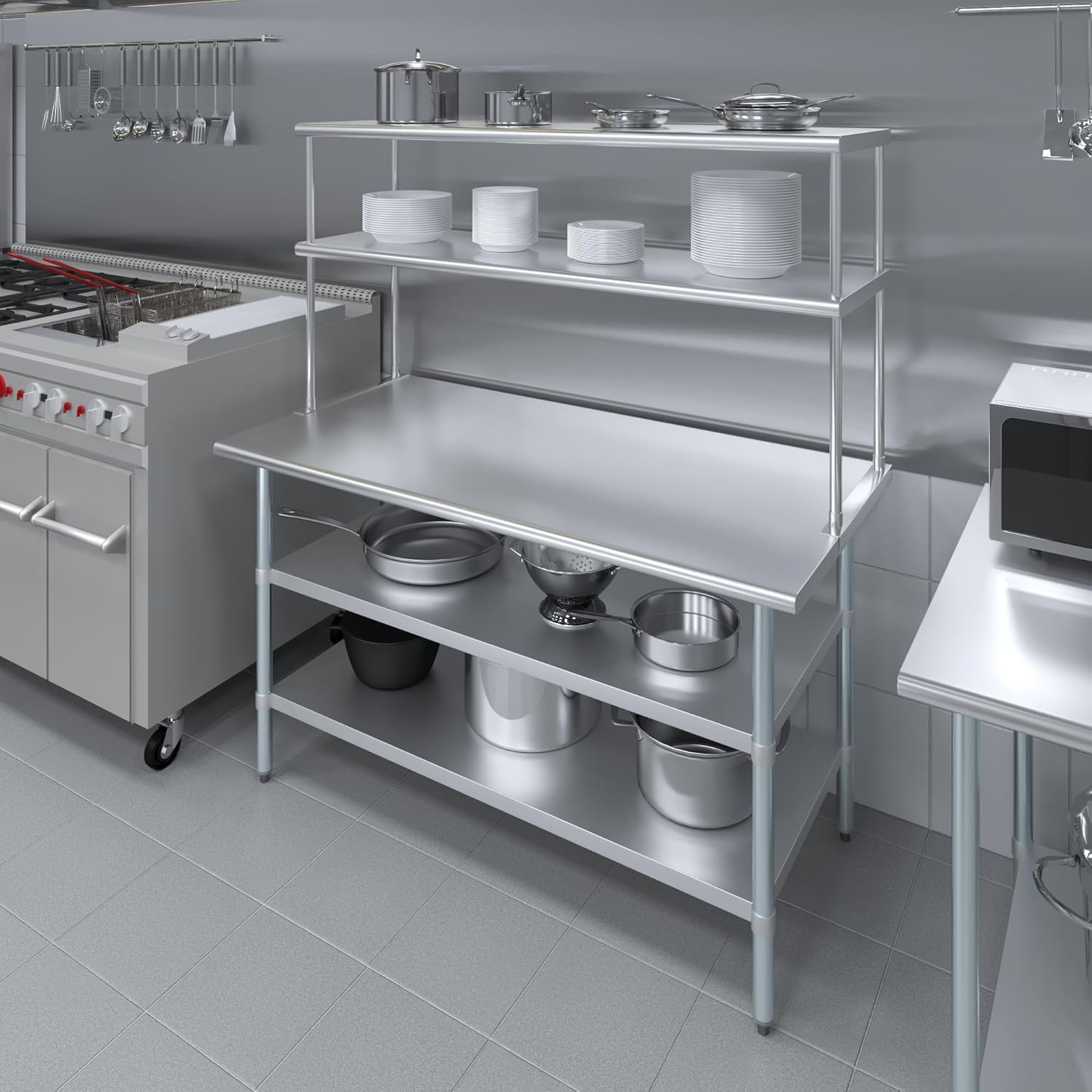 - WORK SAFETY: Work table top and double tier adjustable shelves are constructed from 18-gauge stainless steel, making this restaurant prep and serve table and double tier shelf combo set is durable and long lasting. The table top comes with a galvanized under-shelf for additional storage and adjustable legs for convenience. This table and shelf set is specifically designed and finished for use in a commercial or industrial setting, but is just as reliable in the home.
