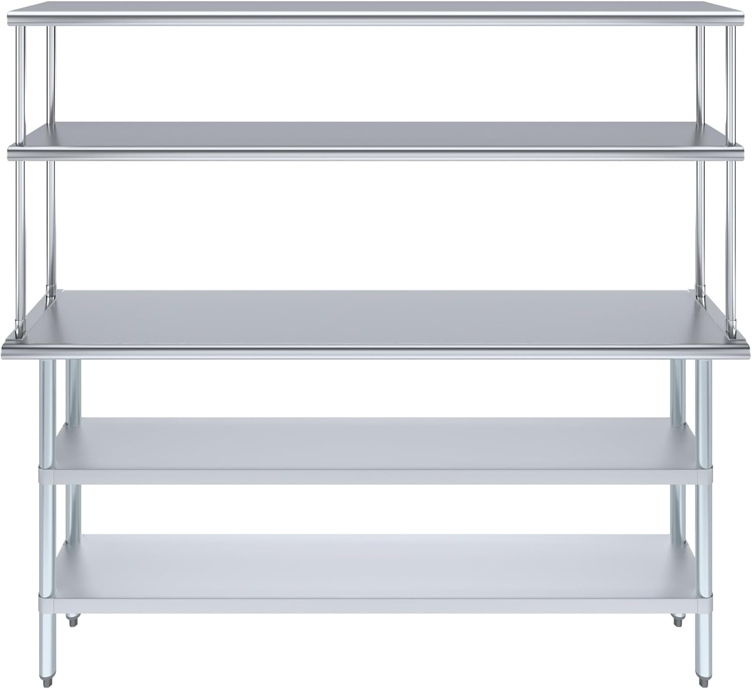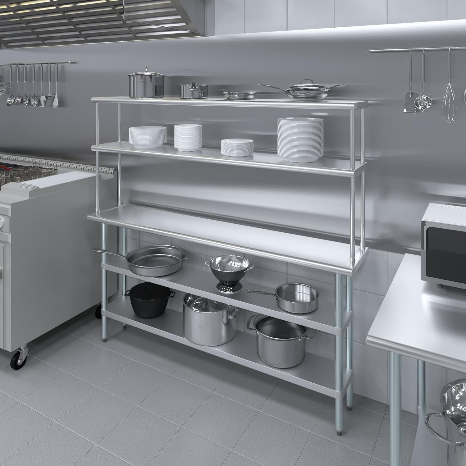 - WORK SAFETY: Work table top and double tier adjustable shelves are constructed from 18-gauge stainless steel, making this restaurant prep and serve table and double tier shelf combo set is durable and long lasting. The table top comes with a galvanized under-shelf for additional storage and adjustable legs for convenience. This table and shelf set is specifically designed and finished for use in a commercial or industrial setting, but is just as reliable in the home.