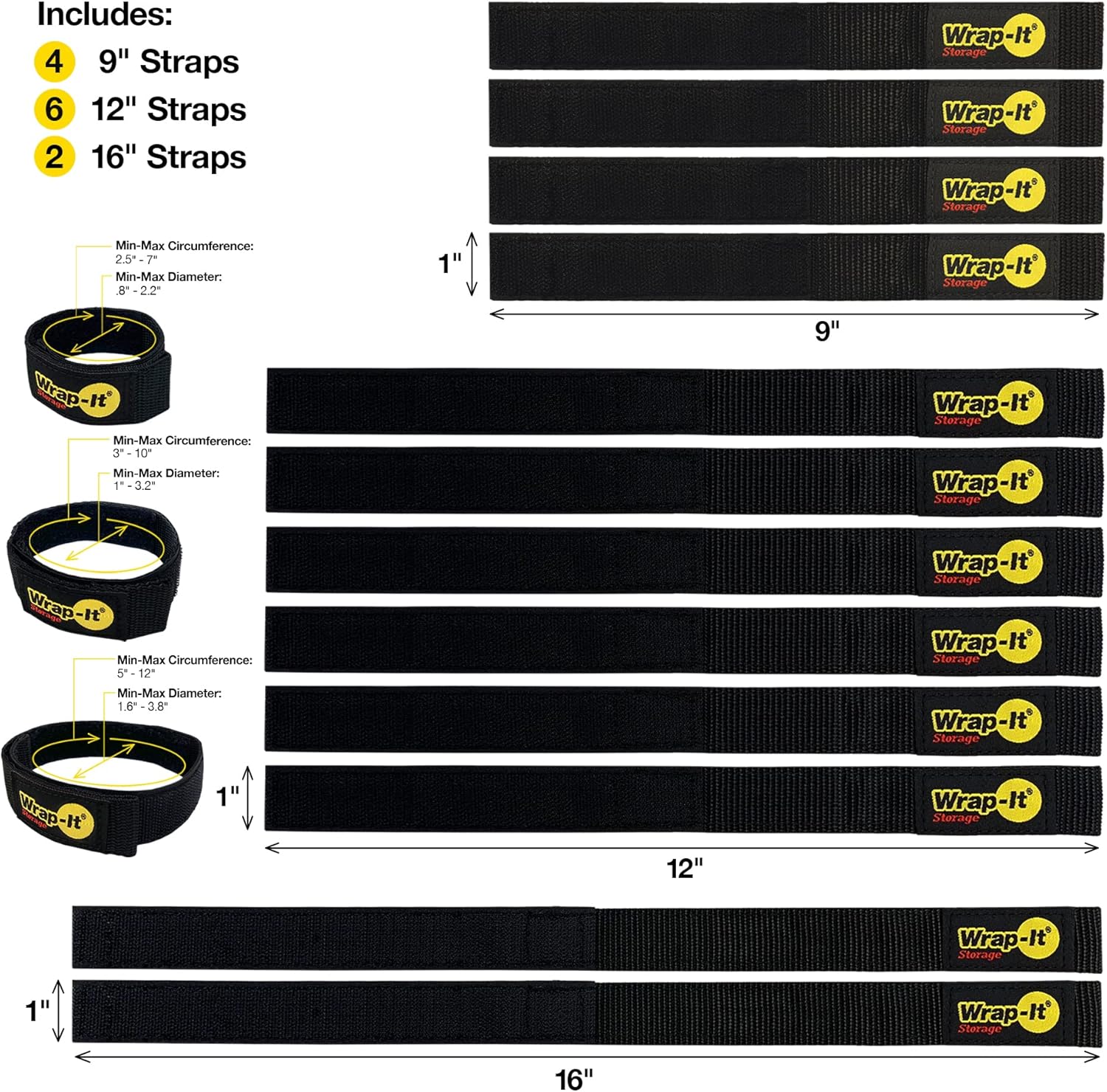 - INCLUDES - (4) 9-inch, (6) 12-inch, and (2) 16-inch x 1-inch wide black hook and loop storage straps + 30-Day Money-Back Guarantee and 2-Year Warranty