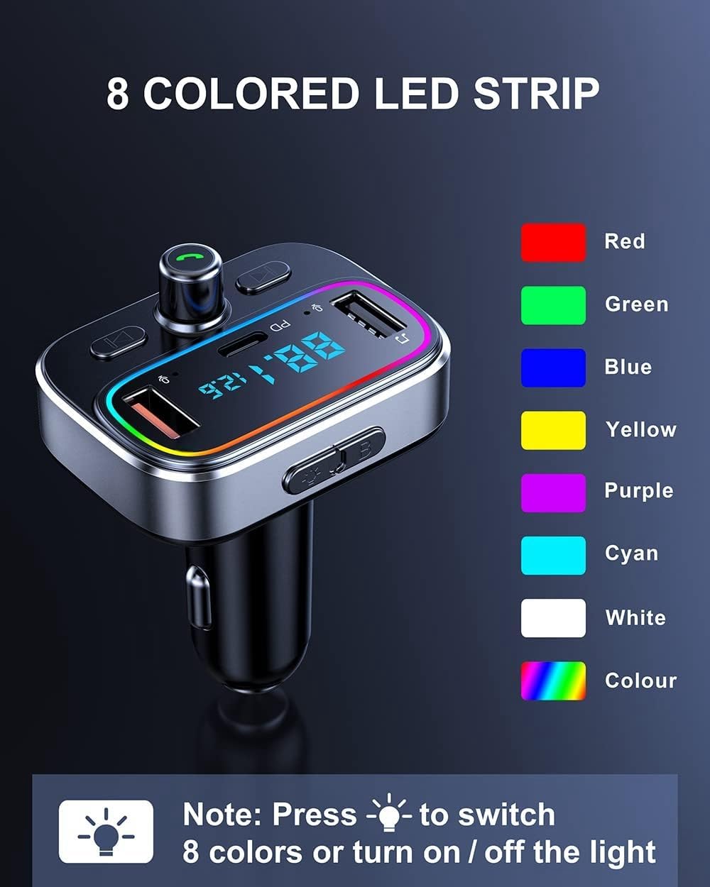 - 7 Colored LED Strip & Music Play Modes: FM Transmitter Bluetooth car adapter supports 7 colors LED backlight, including red / green / blue / yello / purple / cyan / silver white, will give you a visually stunning display of colors, which is a nice way to match the colors already in the car. You can stream music on your car stereo via Bluetooth/ USB Disk (β€32GB) / microSD Card (β€32GB).