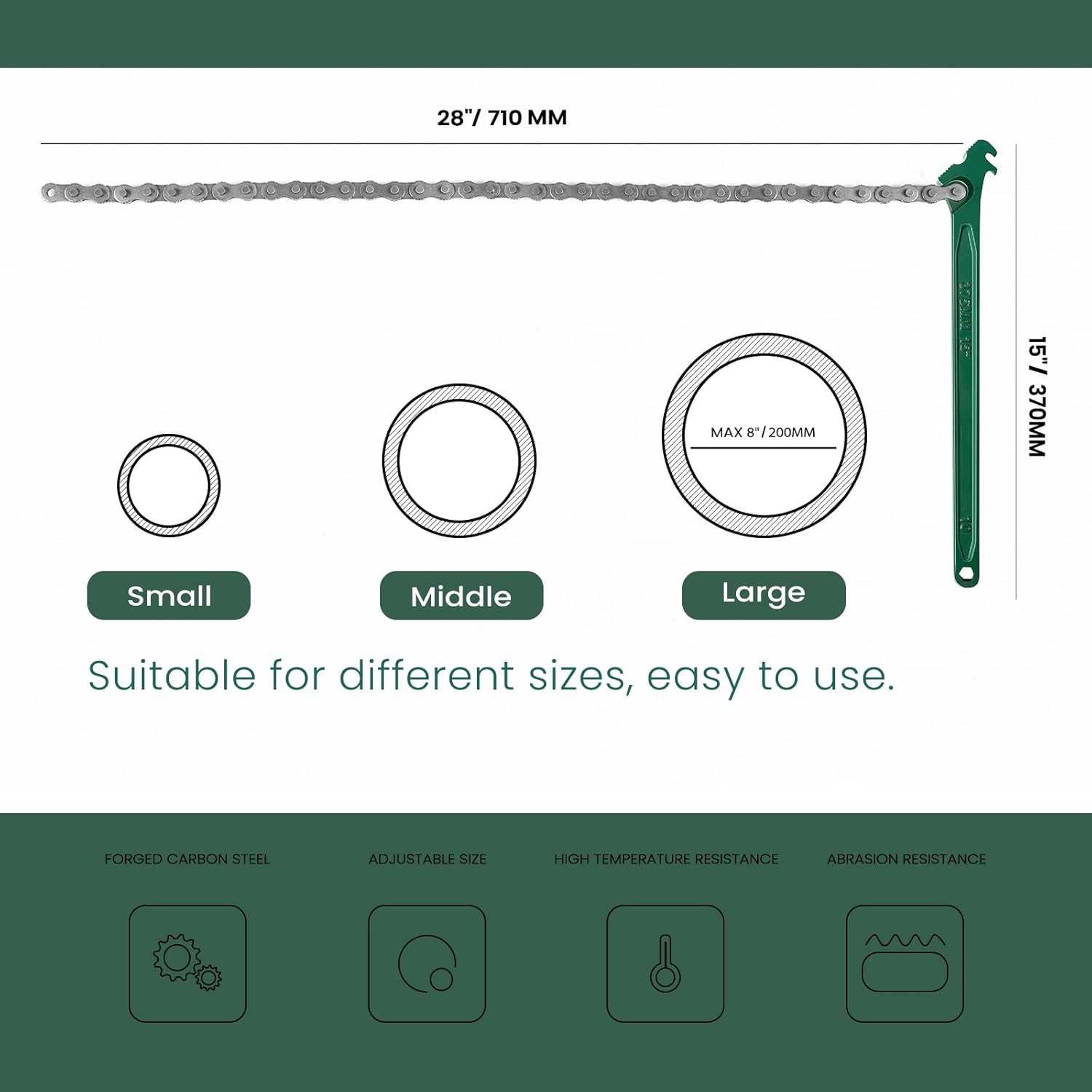 - 【Chain Wrench Size】- Chain Length: 27.5"/700mm; Handle Length: 15" /375mm. Fits 1.5" to 8" diameter.Suitable for Tool Pipe Fittings, Universal Spanner Drain, Sewer Cap, Shower Head Valve Removal.