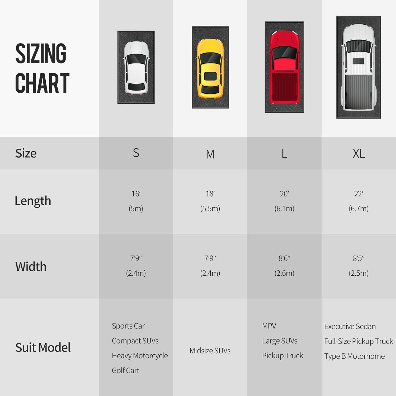 - Large Mat Covering - 4 size options allow you to maximize your limited garage space and match the size of your garage floor or parking lot. This mat is perfect for most types of cars, SUVs, minivans and pickup trucks.