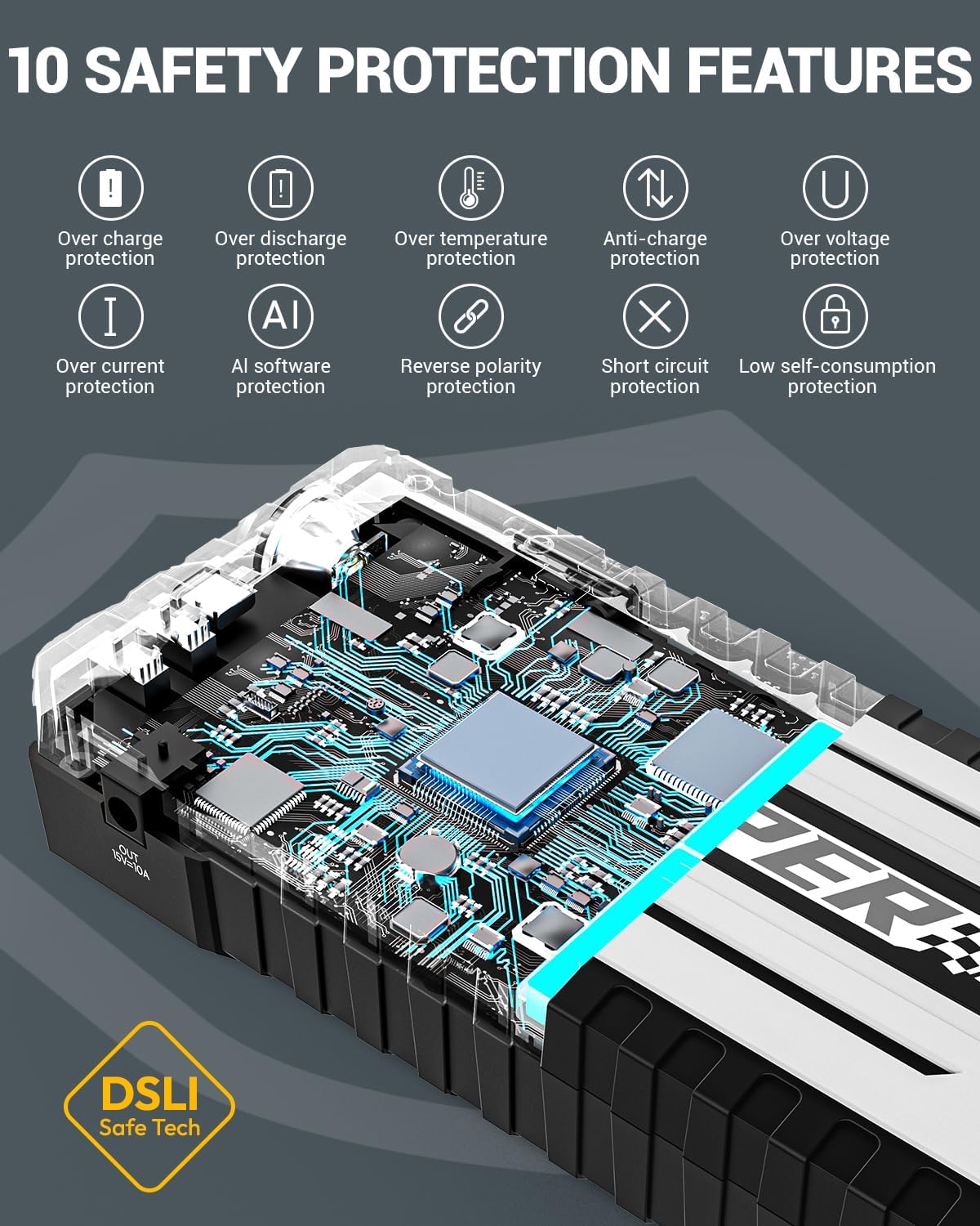 - DSLI IV INTELLIGENT CONTROL TECHNOLOGY - YESPER YJS40 car jumper starter portable. Compared with the previous generation technology, the reassembly of the DSLI IV structure and microcomputer control program increases the voltage by 30% to 14.8V, and the starting current peak value is up to 4120A, achieving 1 second car start. The powerful intelligent temperature control technology reduces the starting temperature, helping you start faster, stronger and safer
