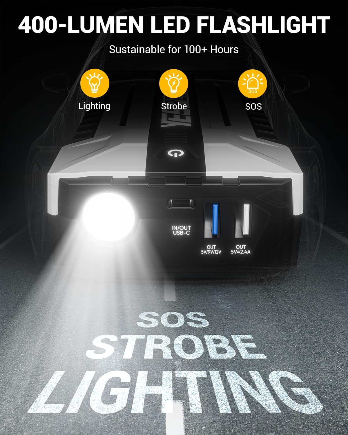 - LED FLASHLIGHT - This car battery jump starter is equipped with 3 LED working light modes: flash light, strobe light and SOS light. This multi-function flashlight is perfect for camping, outdoor, indoor, travel and more, and can also help you in the dark or in emergency situations