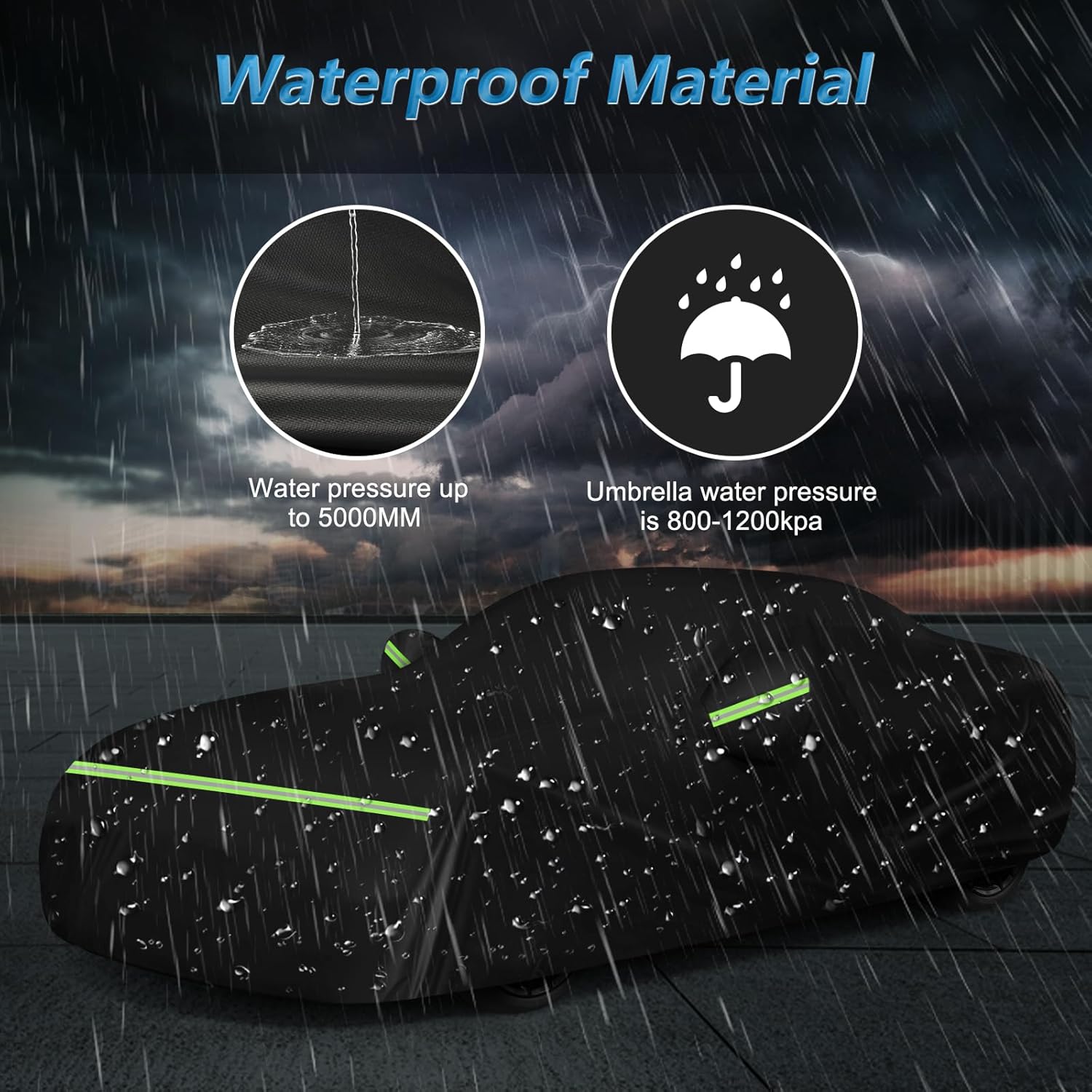 - 【Upgraded Windproof Design】1. Four wheel straps ensure cover stays in place. 2. Windproof buckle through the middle of the car. 3. Elastic Straps at front and rear for secure fit and protection against heavy wind. 4. Enhanced durability with elasticized bands and double-stitched seams.
