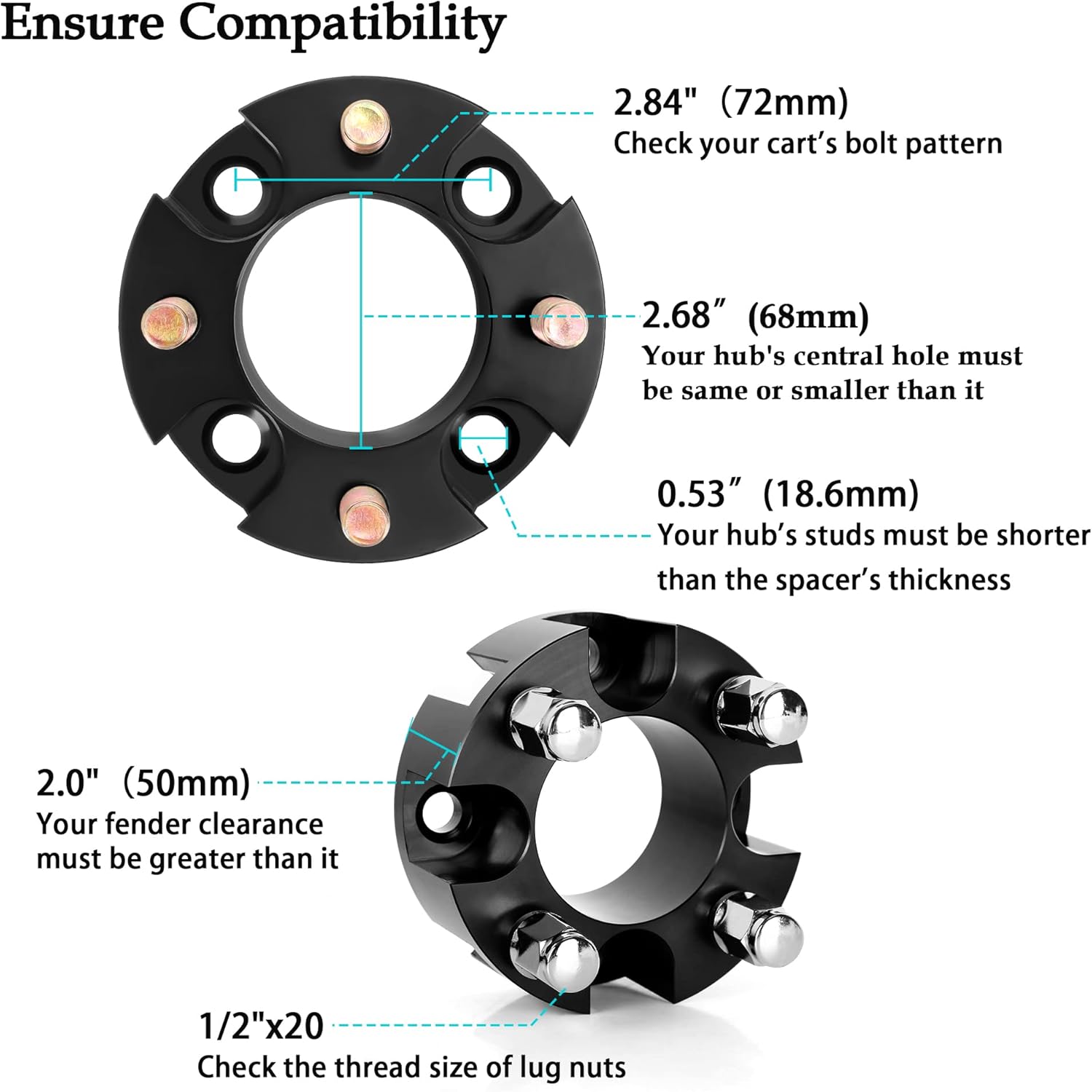 - Specification of 4 wheel spacers: 2" (50mm) thickness, 4x2.84"(72mm) bolt pattern, 3.68"(68mm) hub center bore, come with 16 pcs 1/2"-20 external nuts (internal use of original nuts)