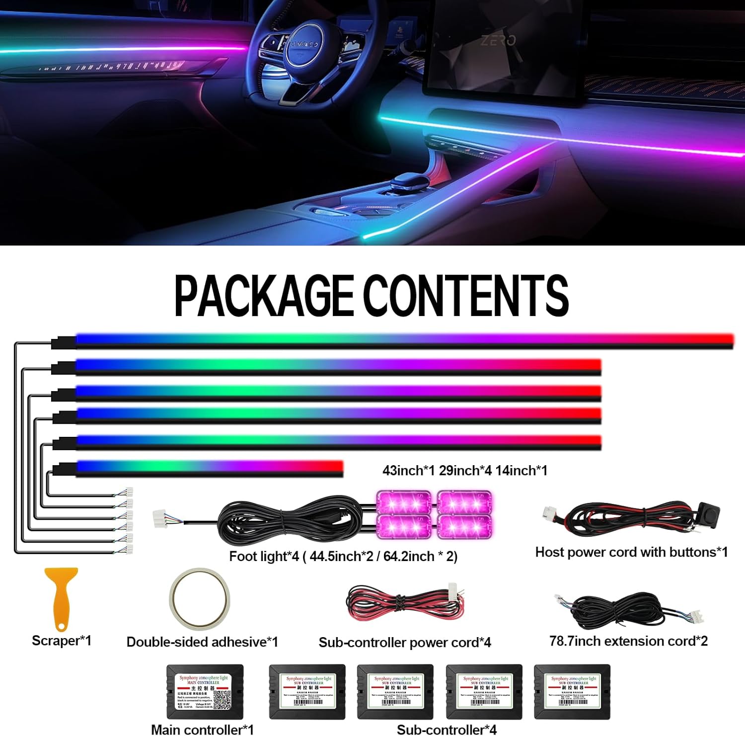 - 【RGBI Dreamcolor 10-in-1 Car Ambient Light】 This interior car LED light consists of 6 acrylic fiber optic light strips(175-inch 593 LED lights) and 4 under dash lights, and has one master controller and 4 slave controller, which can be flexibly installed in any car without clutter. The dreamcolor lighting effect of the upgraded RGBIC can bring you a different experience.