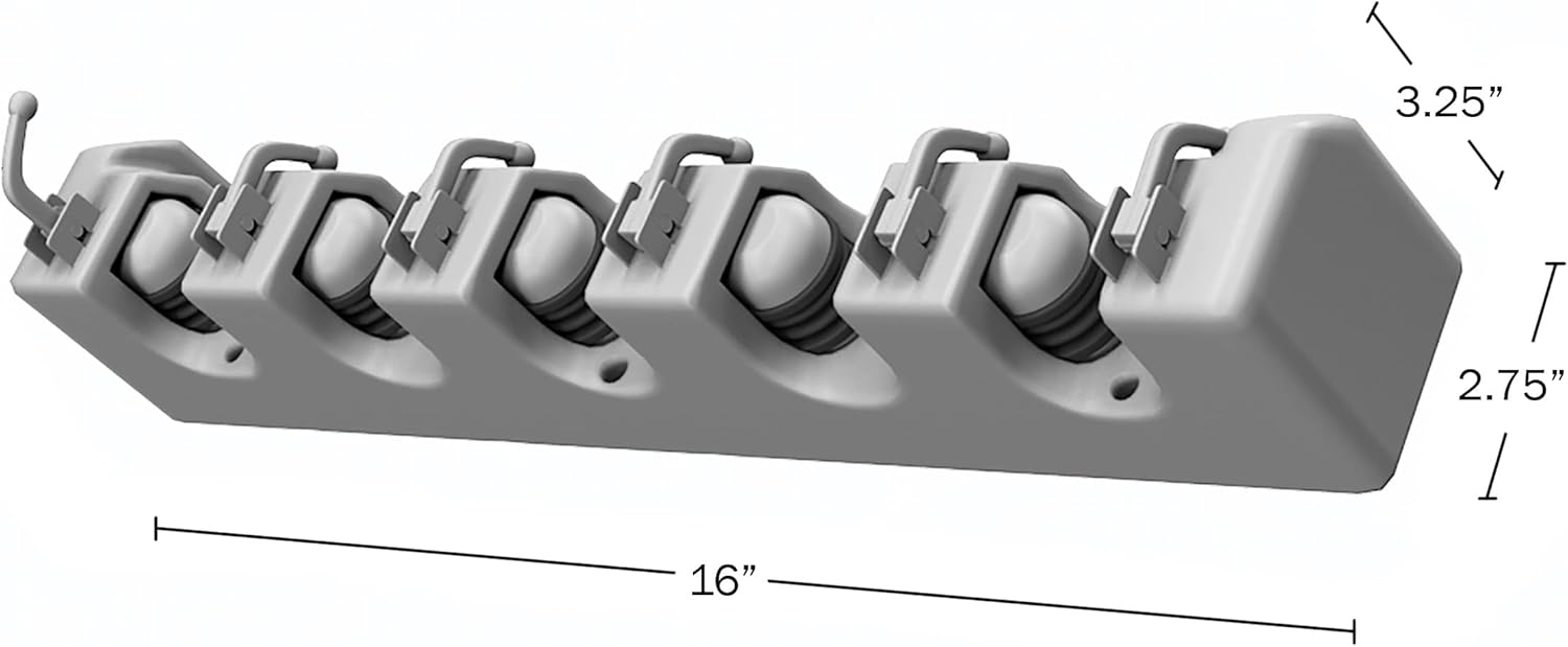 - PRODUCT DETAILS – Materials: High-Density Plastic and Rubber. Dimensions: (L) 16” x (W) 2.75” x (H) 3.25”. Installation Hardware is Included with Garden Tool Storage. Color: Gray.
