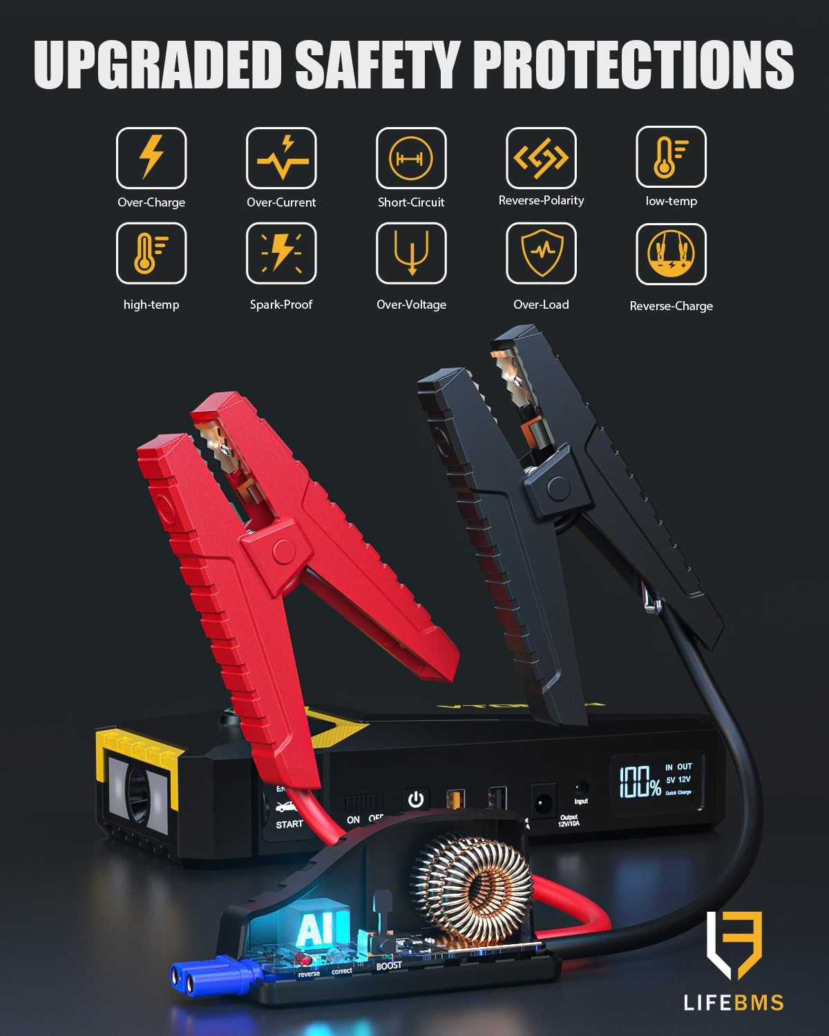 - 10 Enhanced Safety Technology - VTOMAN V8 Pro car battery jump starter pack prioritizes safety and ease of use. The jump cable indicator uses a reverse red light to notify you of incorrect usage, eliminating any concerns about incorrect connections or sparks. It offers a comprehensive range of protection features, including spark-proof, reverse-charge, over-current, over-charge, reverse-polarity, high-temp, low-temp, short-circuit, over-voltage, and over-load protection.