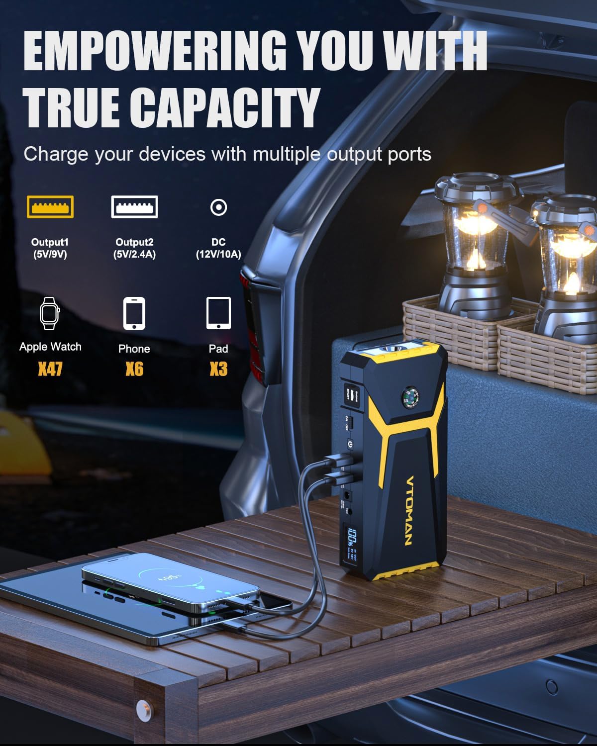 - A Versatile Emergency Power - Designed with dual USB outputs (5V/9V and 5V/2.1A), the quick charge port efficiently powers cell phones, tablets, and other devices. The VTOMAN V8 Pro car jump starter also features a 12V/10A DC port for other car products. The LCD screen indicates the remaining power, ensuring a reliable phone charger in your car.